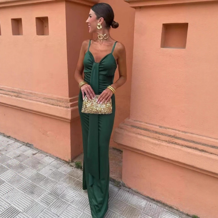 歐美女裝爆款緞面V領褶皺無袖連衣裙