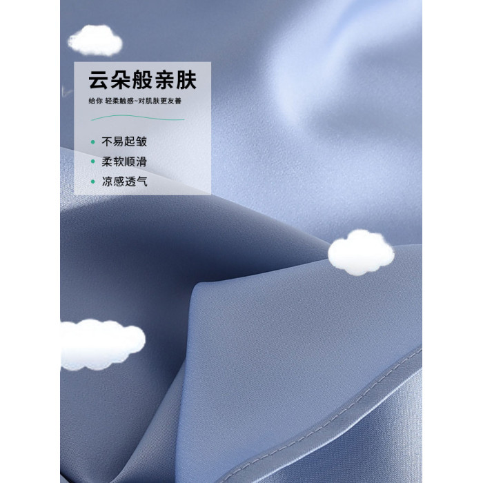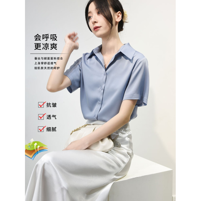 藍醋酸緞面短袖襯衫女夏抗皺免燙法式上衣慵懶風通勤職業襯衣
