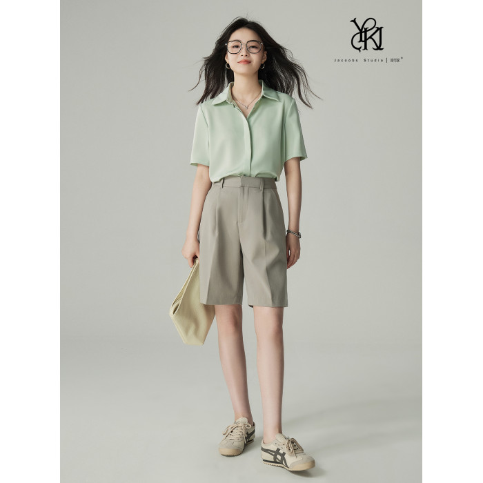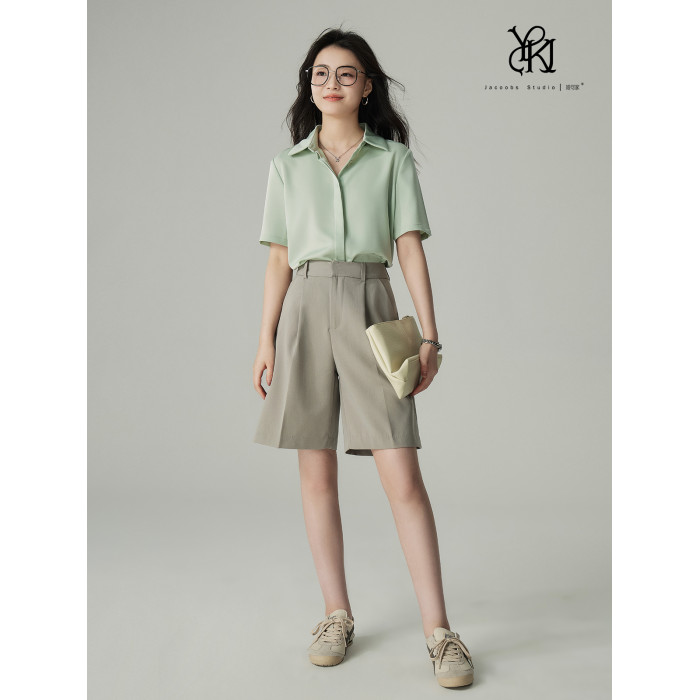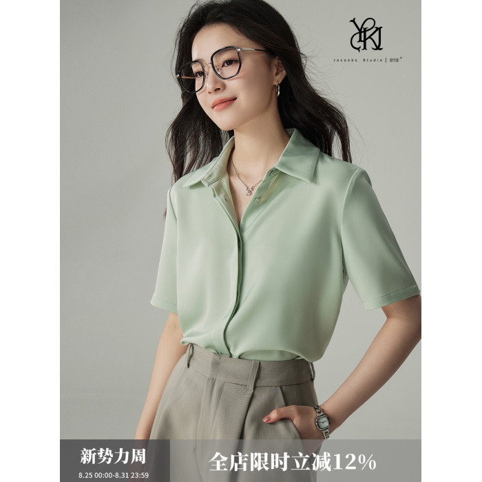 婭可家暗門襟緞面短袖襯衫女夏季垂感不易皺通勤職業面試襯衣上衣