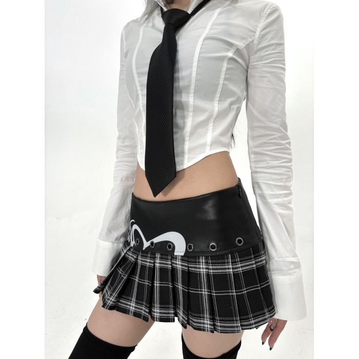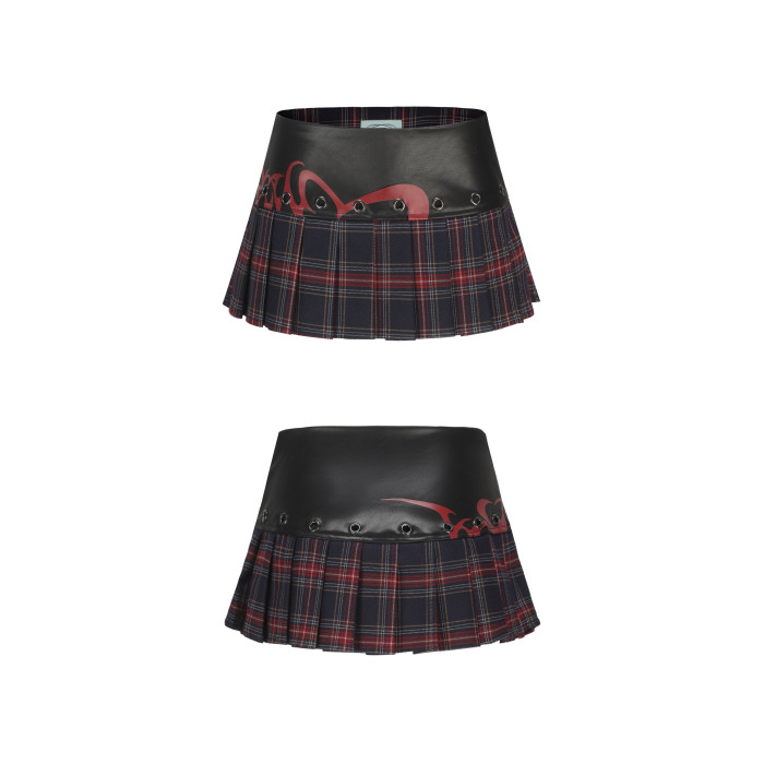 ONNASENSHI 原創皮質拼接超短裙 復古自帶安全褲低腰格子百褶裙