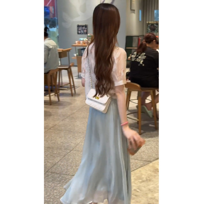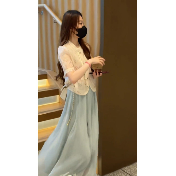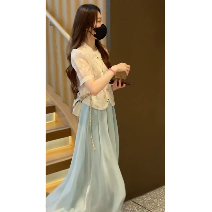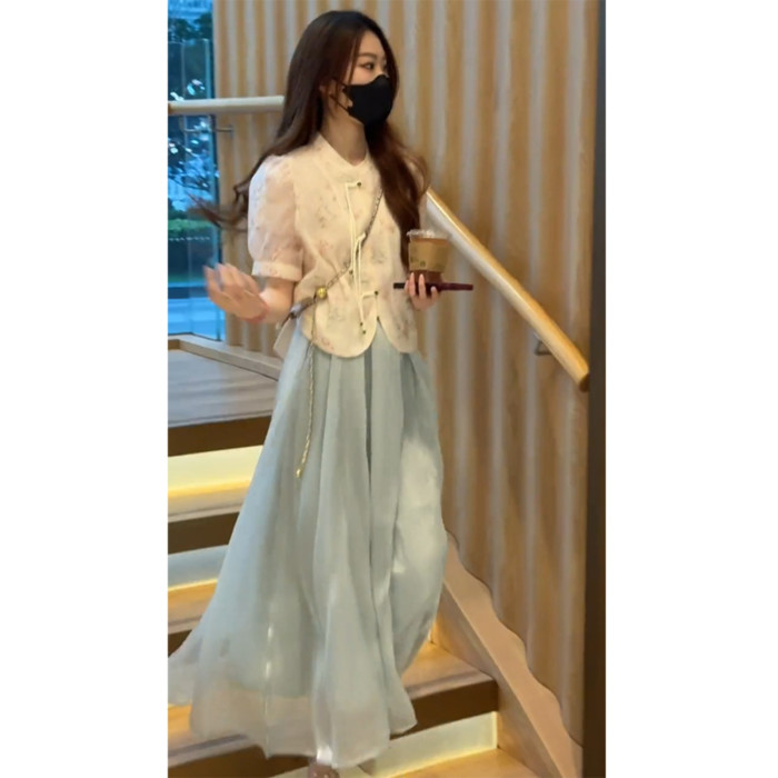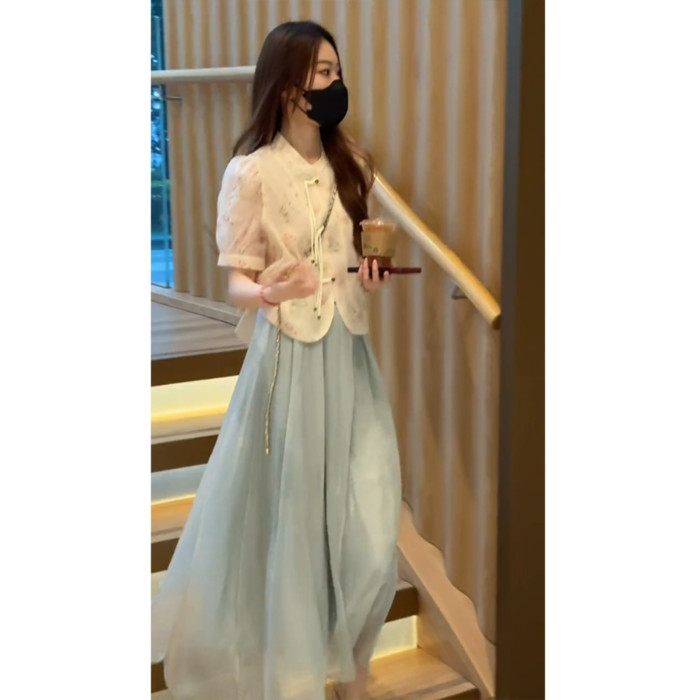 2025夏季綠色高腰中長款新中式國風半身裙A字仙女網紗裙漢服套裝