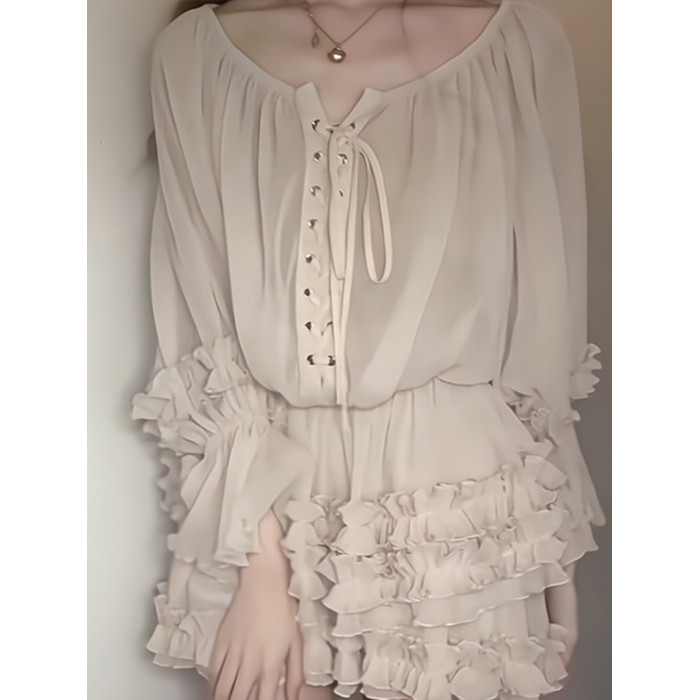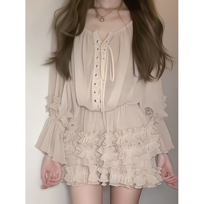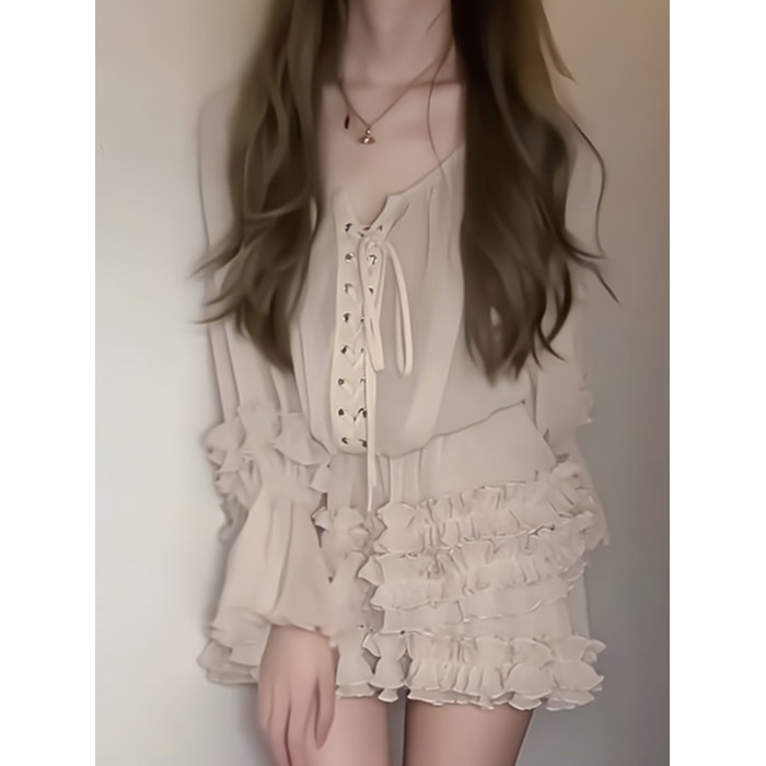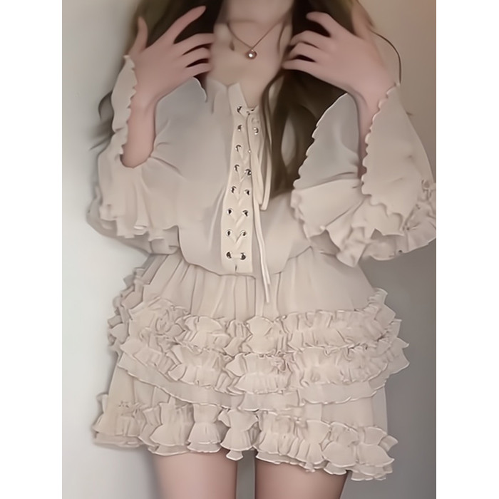 今年流行減齡漂亮洋氣別致絕美套裝甜美木耳邊上衣短裙搭配一整套