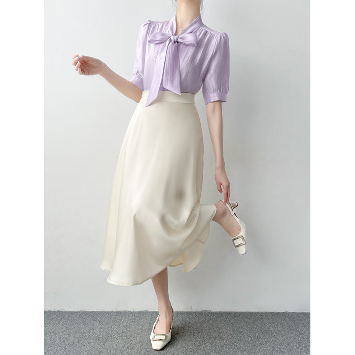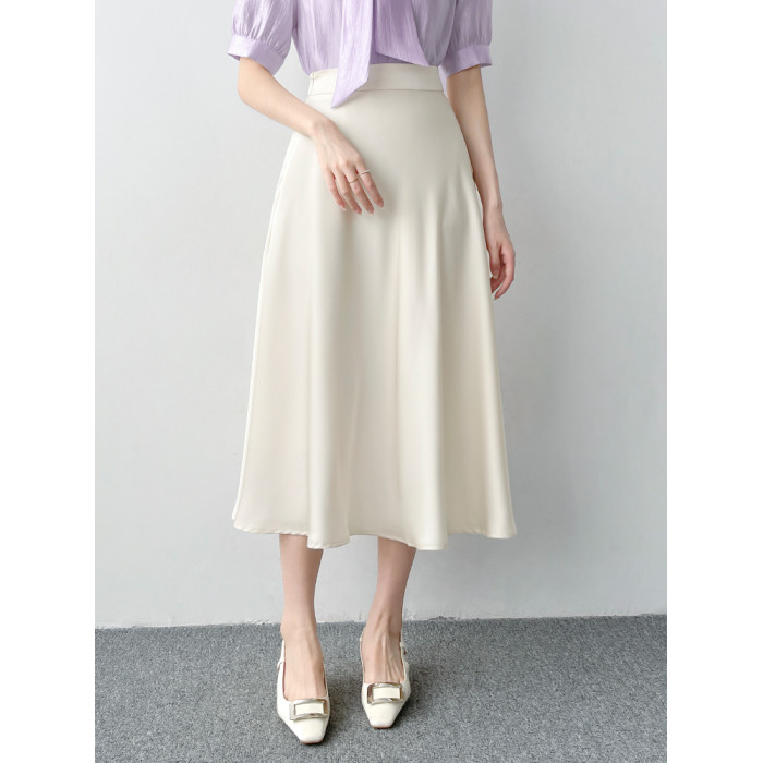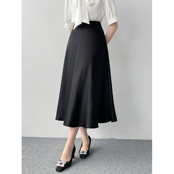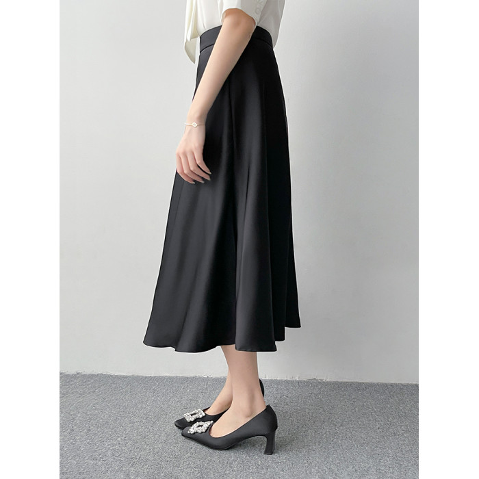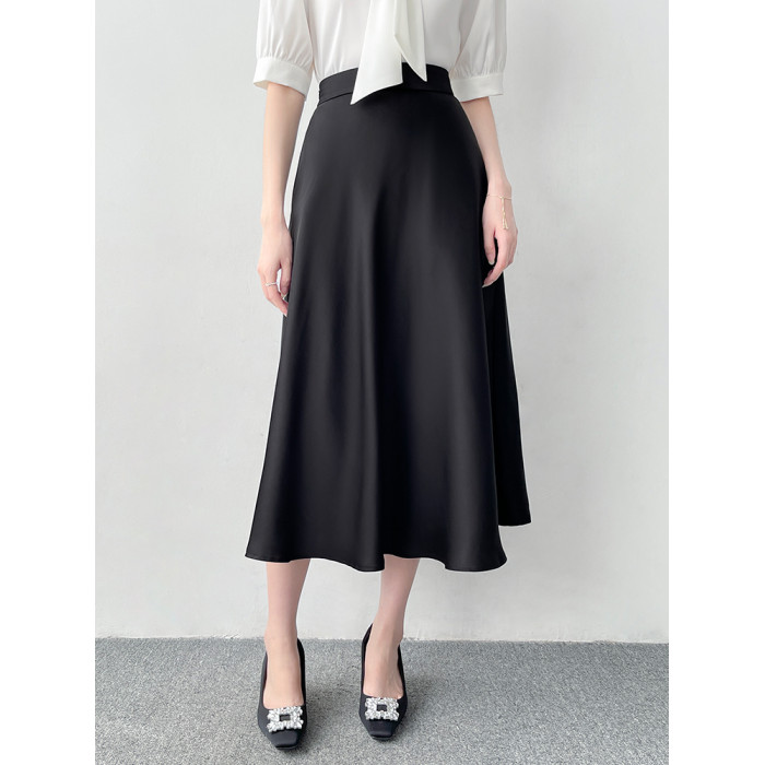 韓帛雅高腰a字黑色半身裙女夏柔光緞面大擺繖裙職業通勤百搭裙子