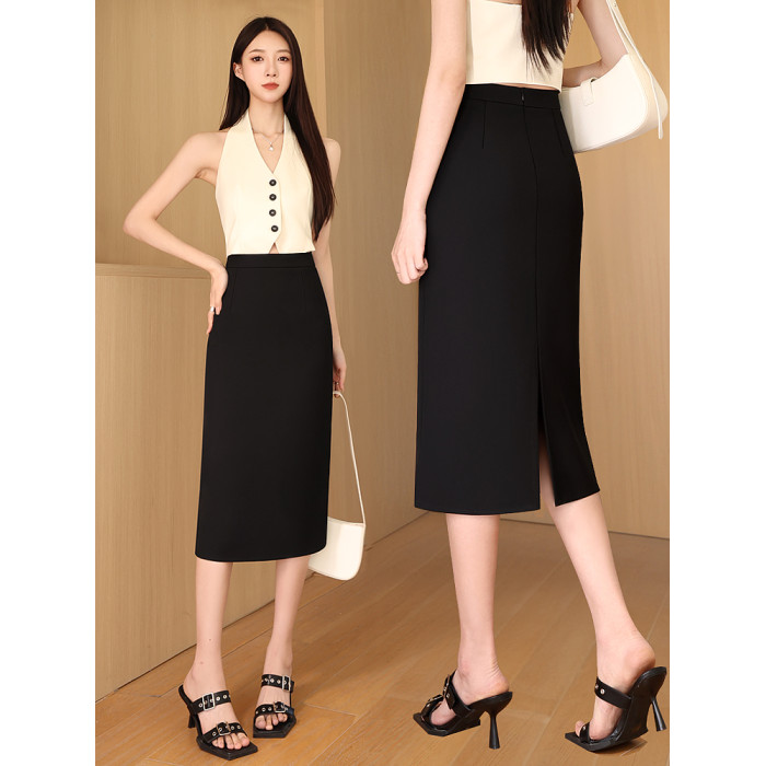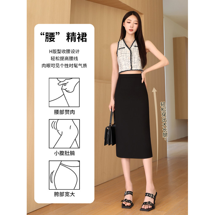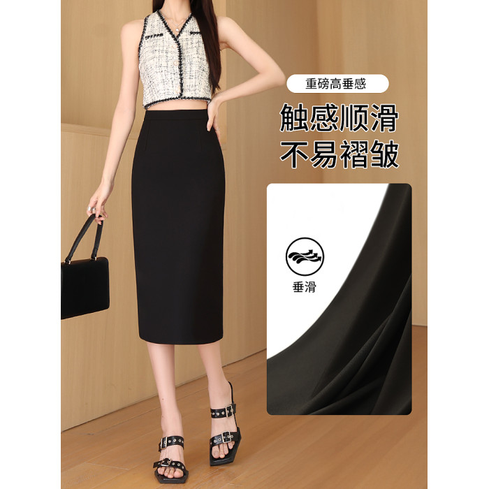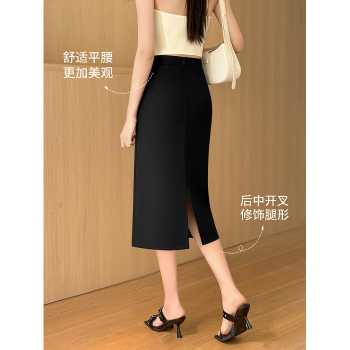 西裝半身裙女夏季高腰氣質包臀直筒中長款垂感開叉半裙黑色一步裙