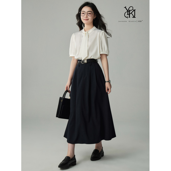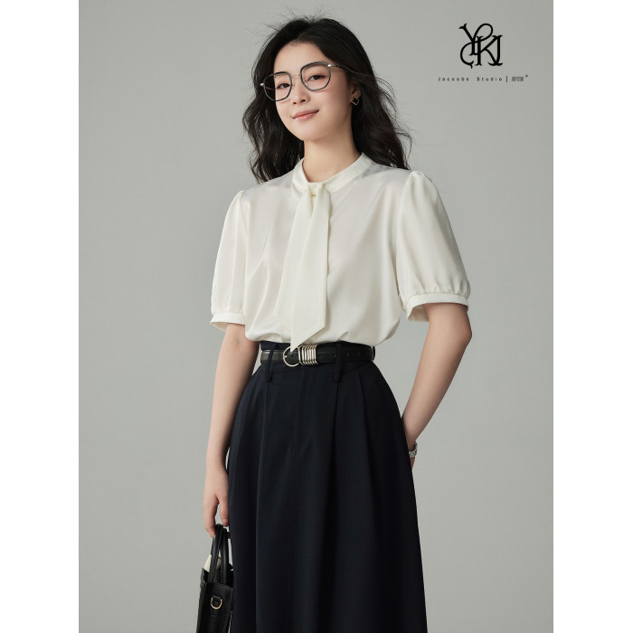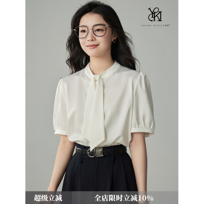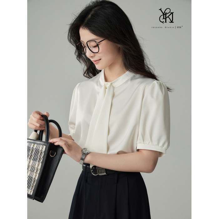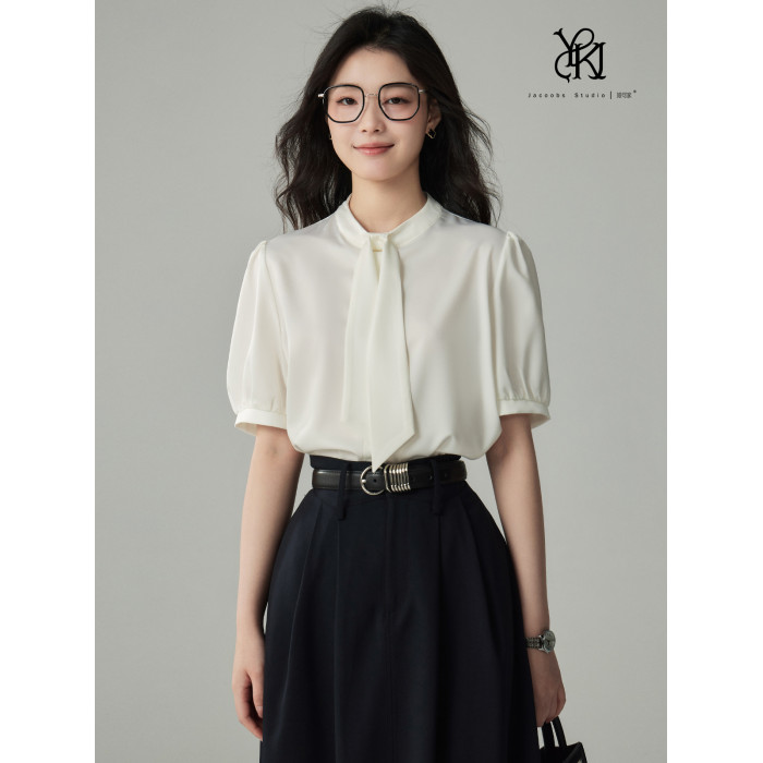 婭可家白色緞面短袖襯衫女設計感小衆輕熟港風飄帶通勤職業襯衣