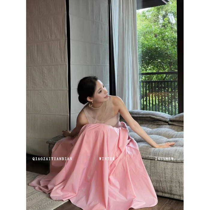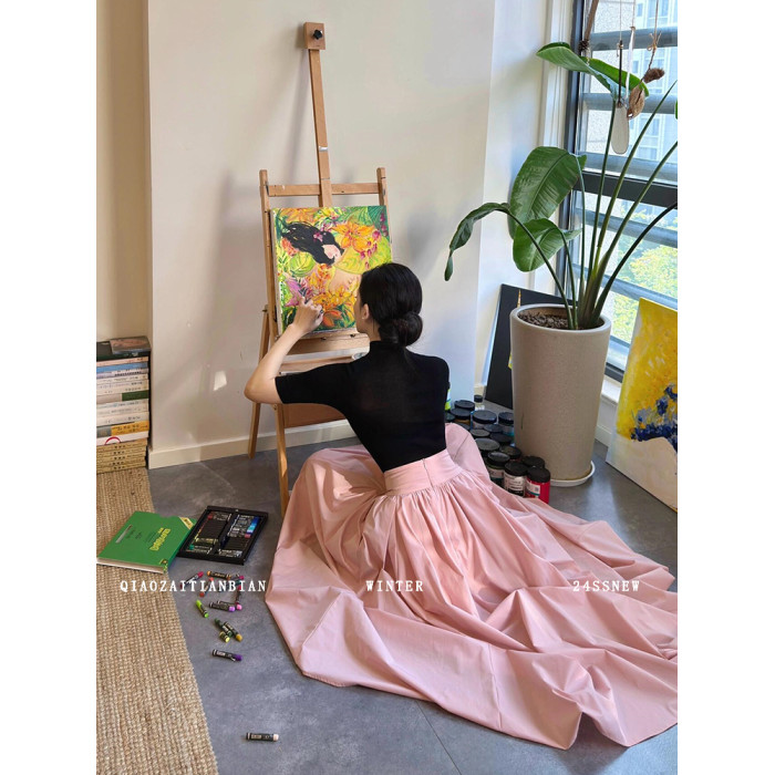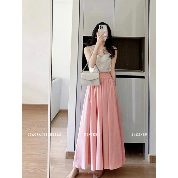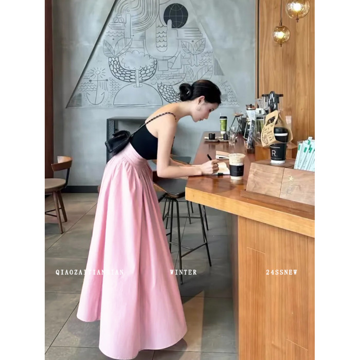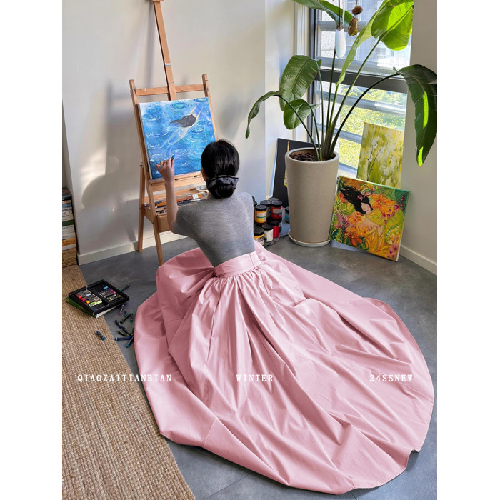 橋在天邊法式高級感粉色高腰百褶半身裙女夏顯瘦氣質大擺繖裙長裙
