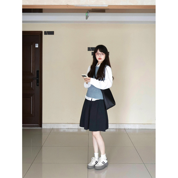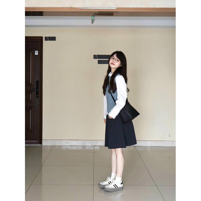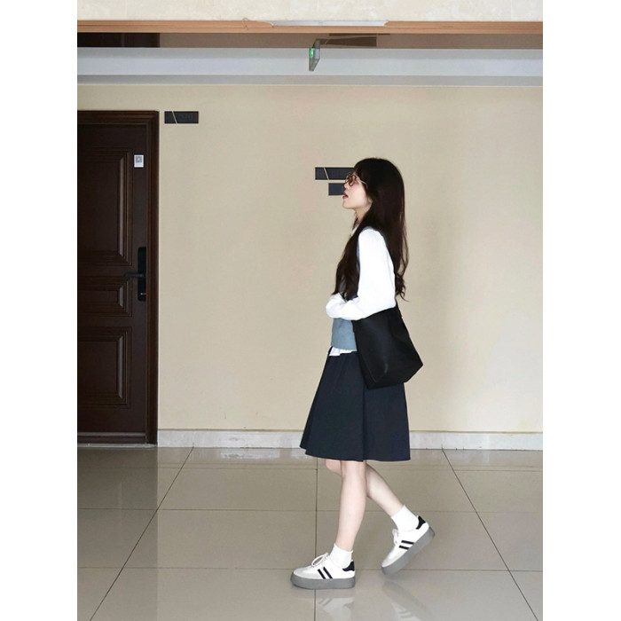 藏青色松緊腰半裙女春秋夏款百搭學院風繖裙小個子a字裙高腰中裙