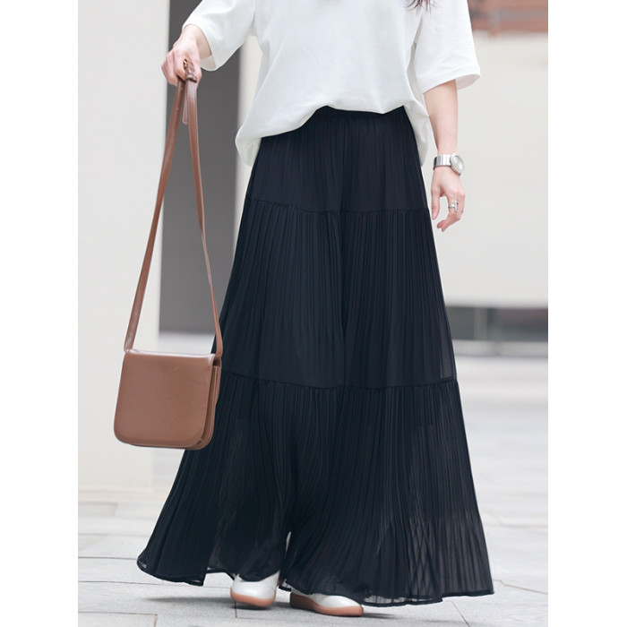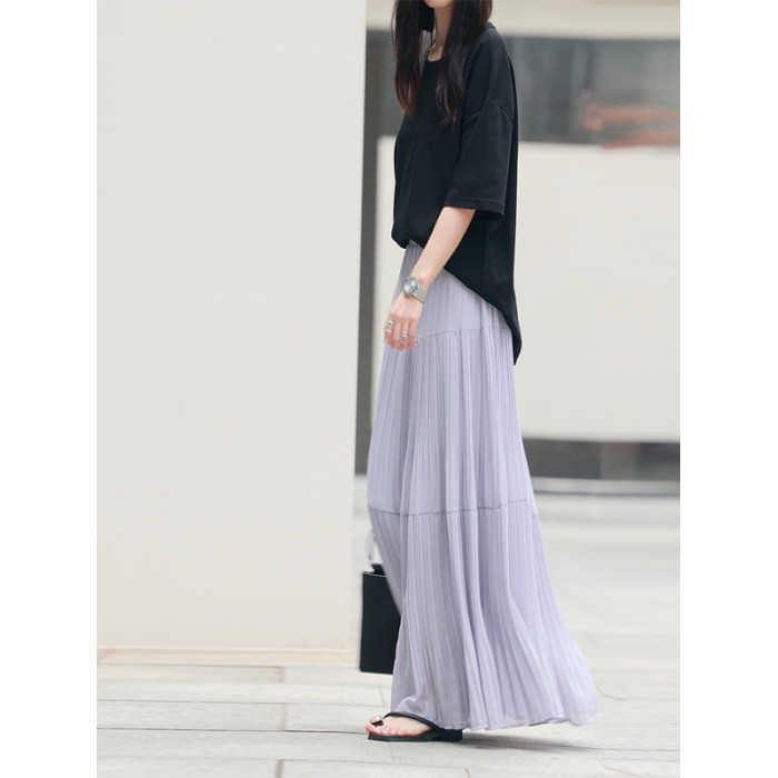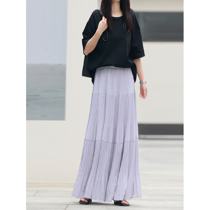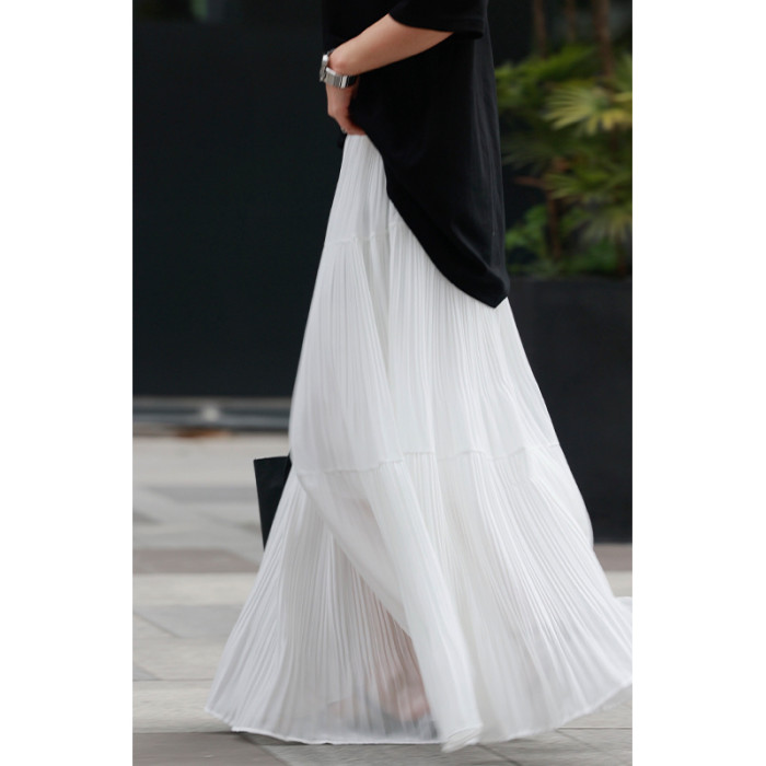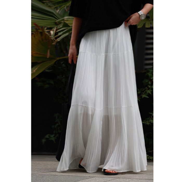 白色壓褶半身裙女春夏新高腰超長款過膝齊踝大擺a字長裙氣質慵懶