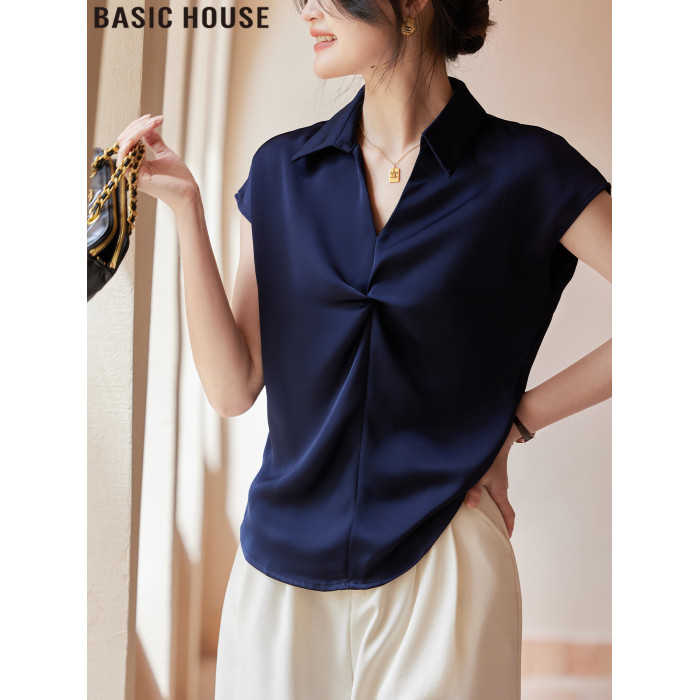 Basic House/百家好藍色V領紐結短袖襯衫女夏季薄款冰絲緞面襯衣