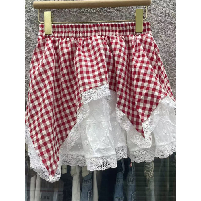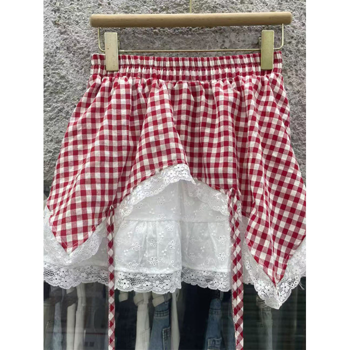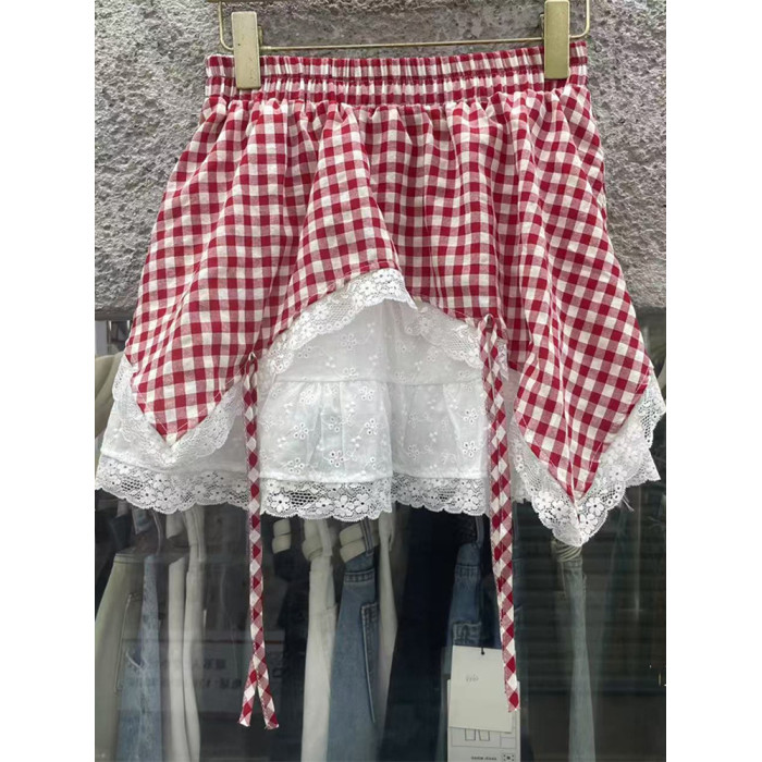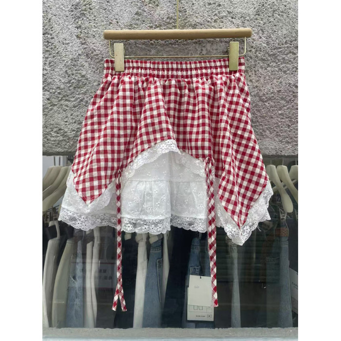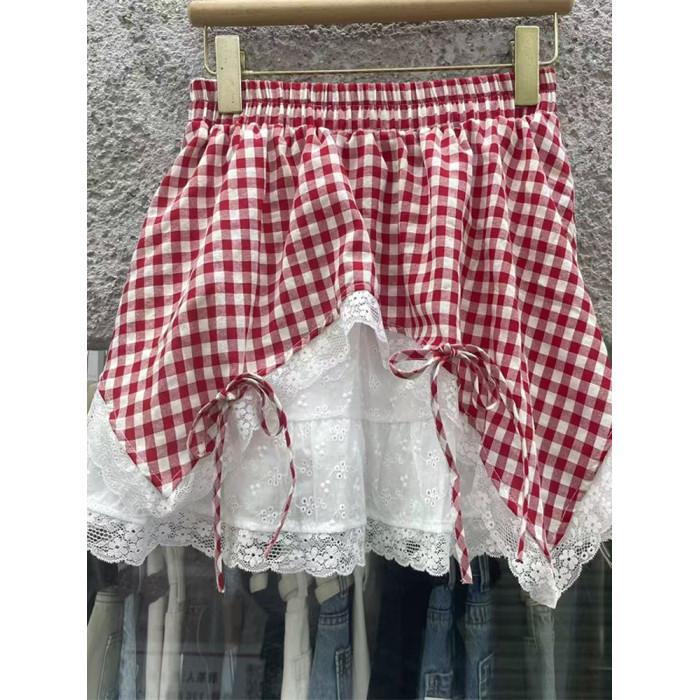 2025春季紅色格子拼蕾絲短裙裙子女時尚顯瘦松緊腰潮流顯瘦遮肉韓