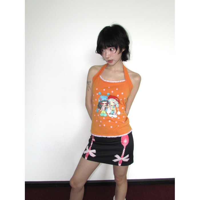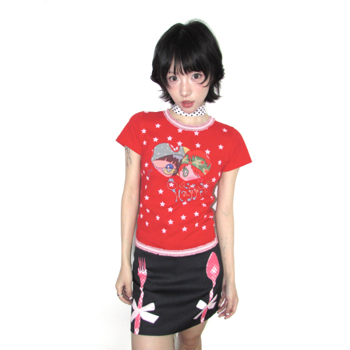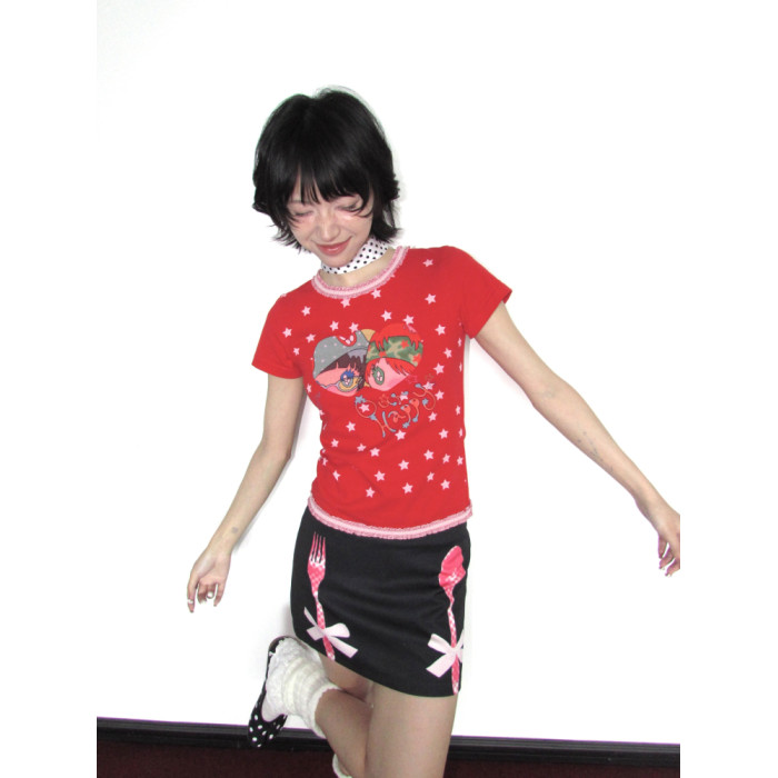 OurHappy25ss原創可愛蝴蝶結刀叉鬼馬印花短裙