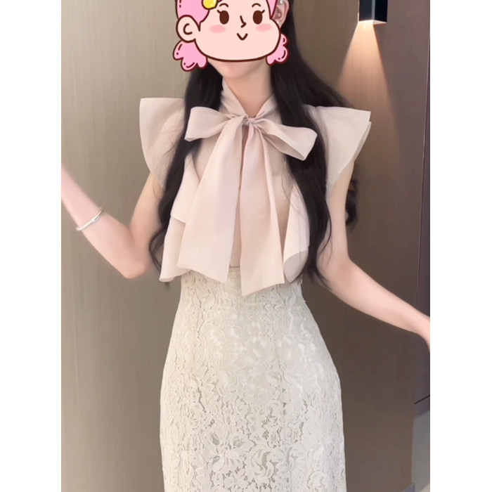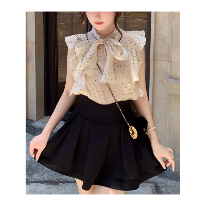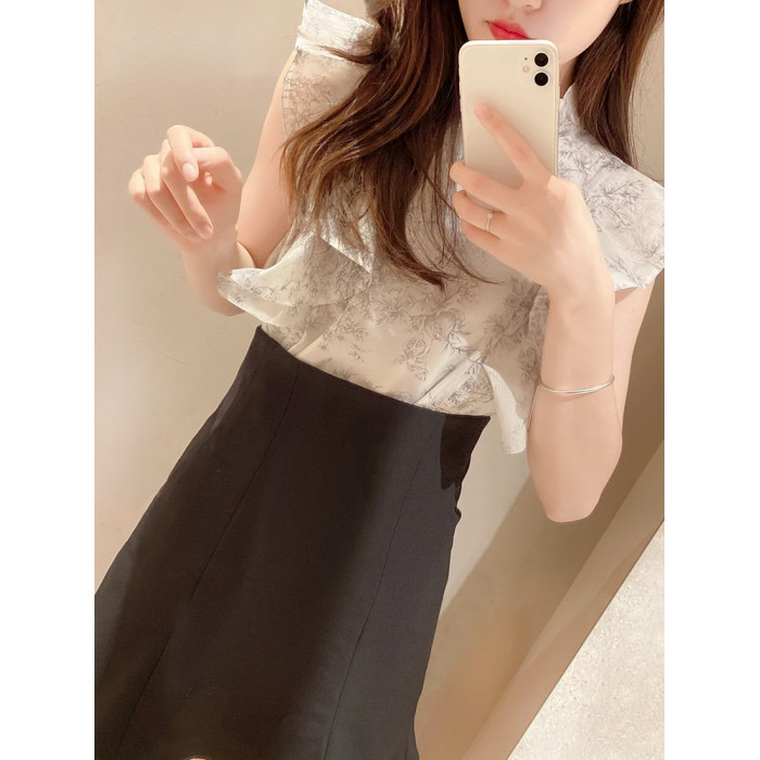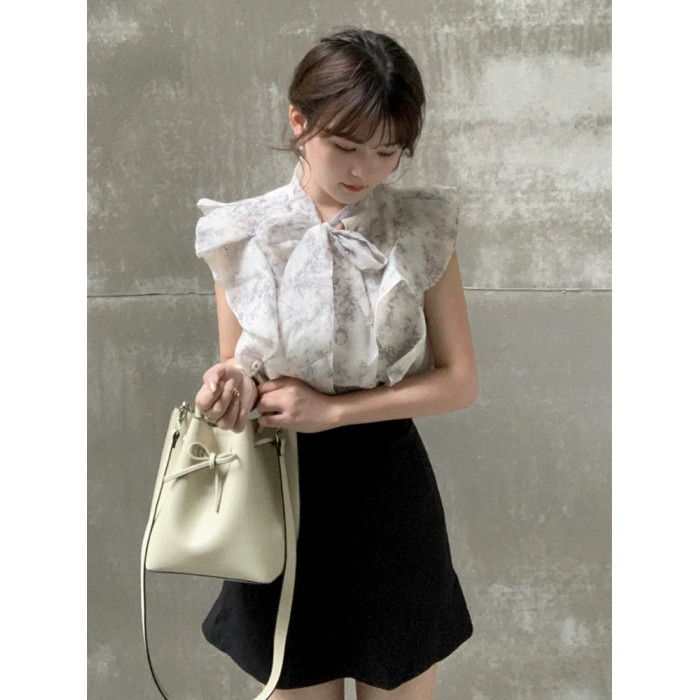 小泡芙日系春夏新款女裝時尚甜美印花小飛袖蝴蝶結系帶襯衫上衣女