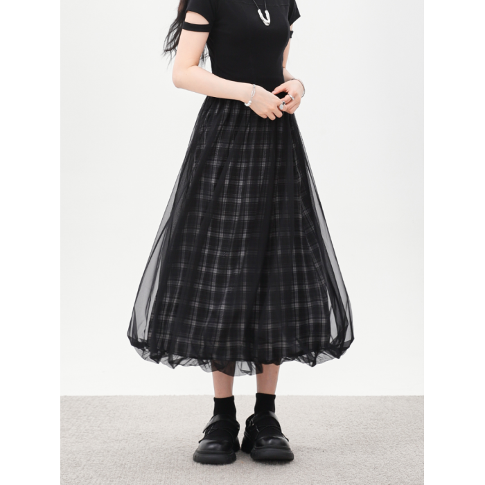 NHOO恩逅 小衆設計感格紋網紗裙夏季2025薄款a字蓬蓬花苞半身裙子