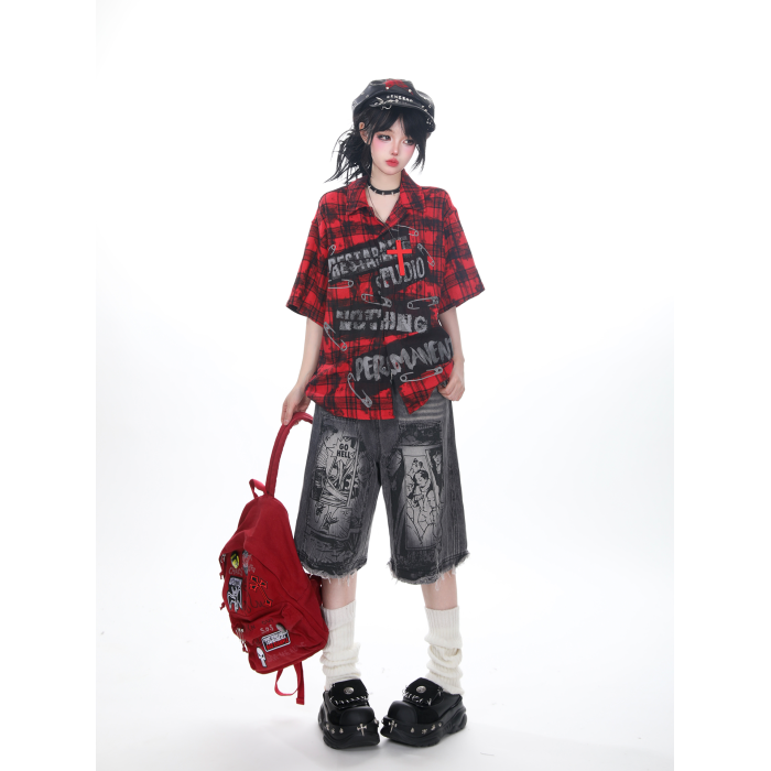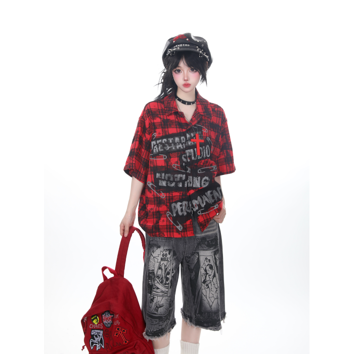 KNOW8原創美式復古格子襯衫男女夏季情侶寬松休閒百搭短袖上衣