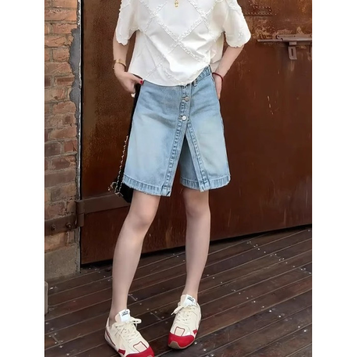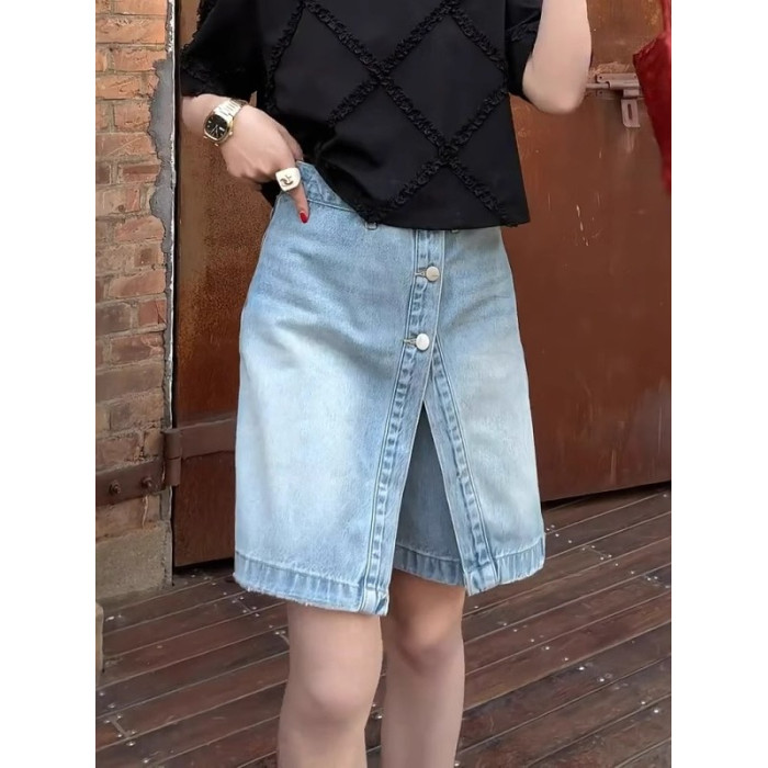 淺藍色牛仔褲裙女2025夏季新款大碼胖mm設計感假兩件A字半身短裙
