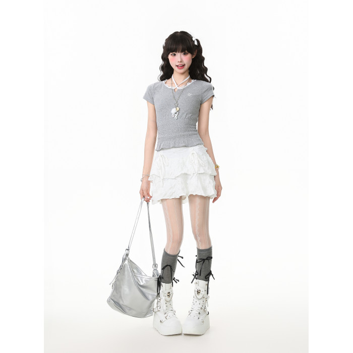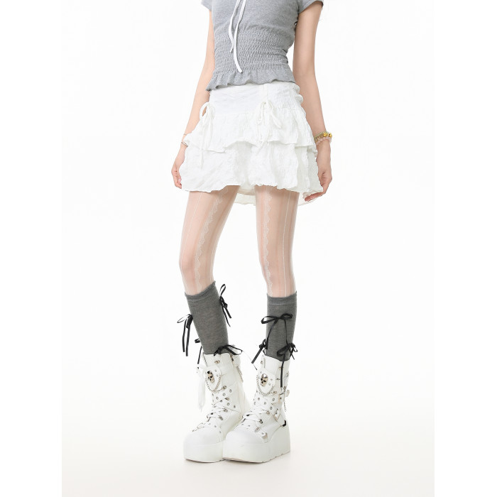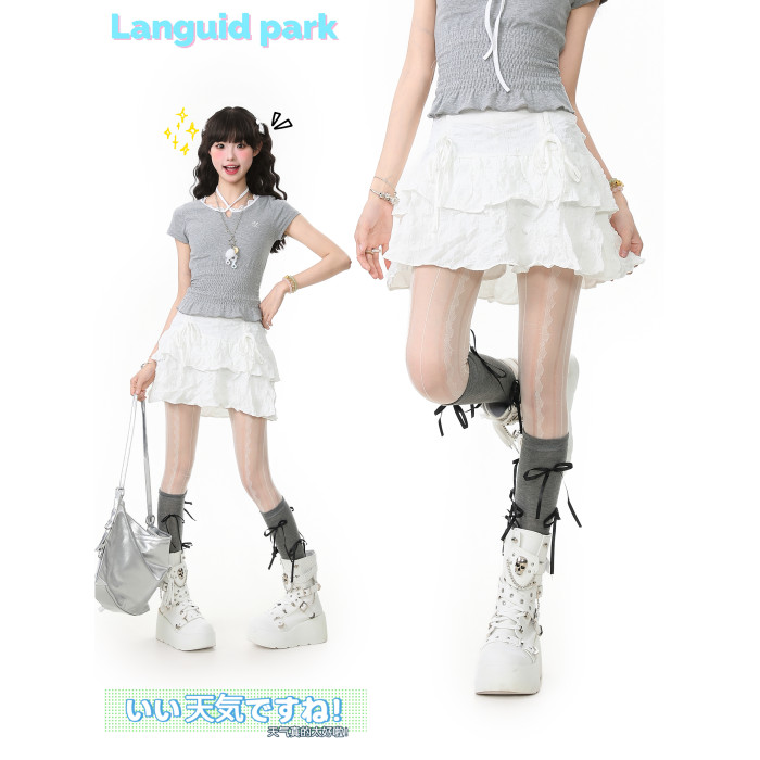 藍鬼公園Languid Park 蝴蝶結白色蓬蓬裙女夏季新款高腰短裙裙子
