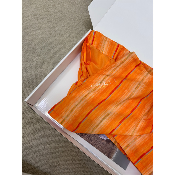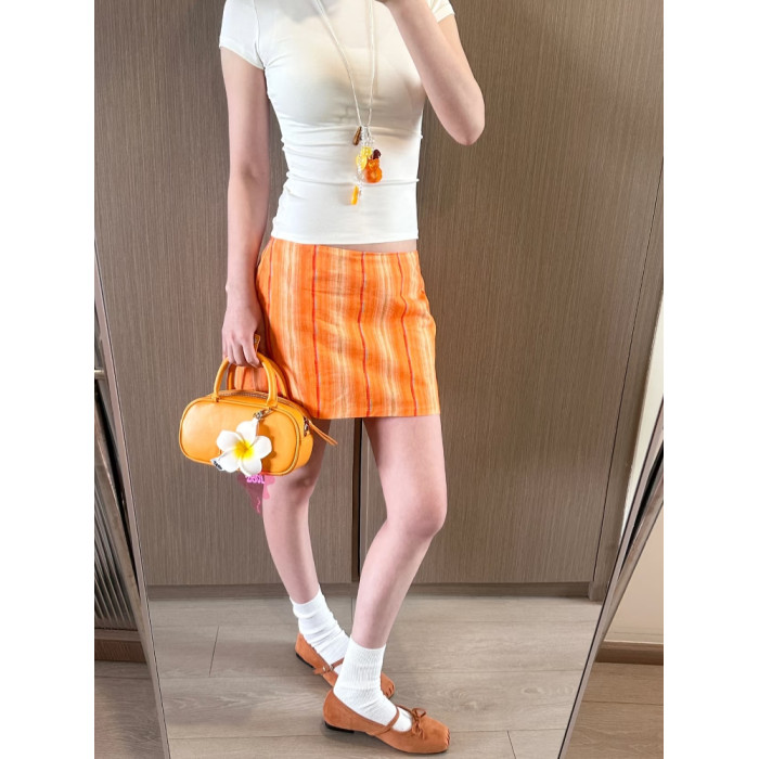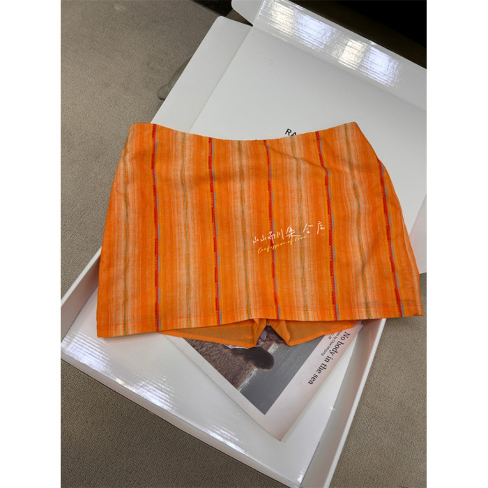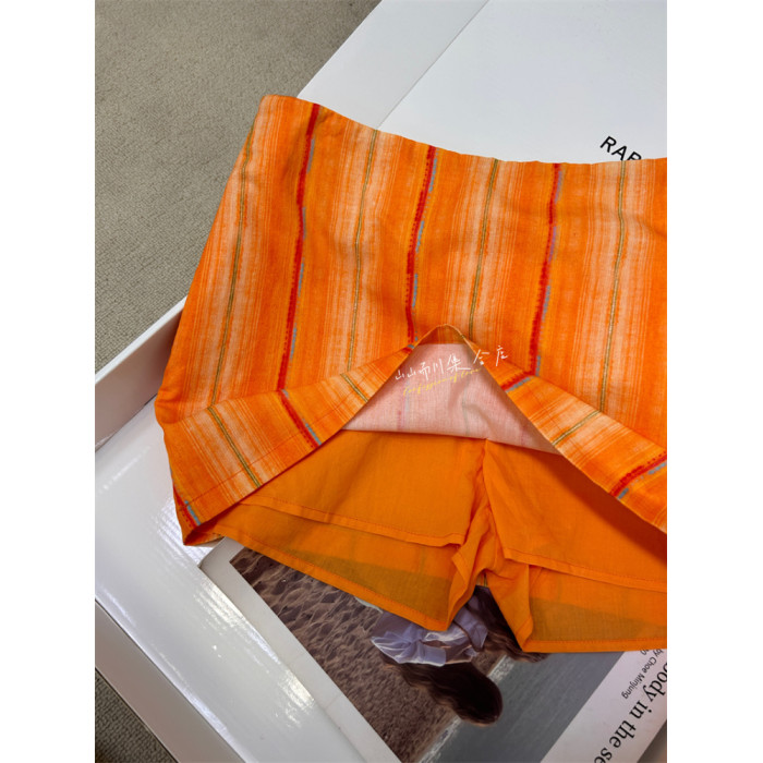 還原 橙色格紋100純棉竪條印花復古顯瘦半裙超短裙 帶安全褲
