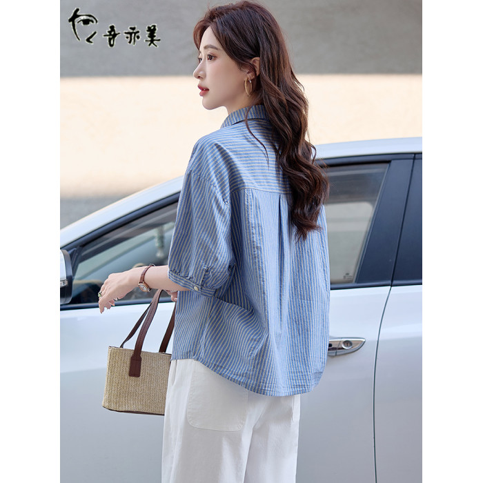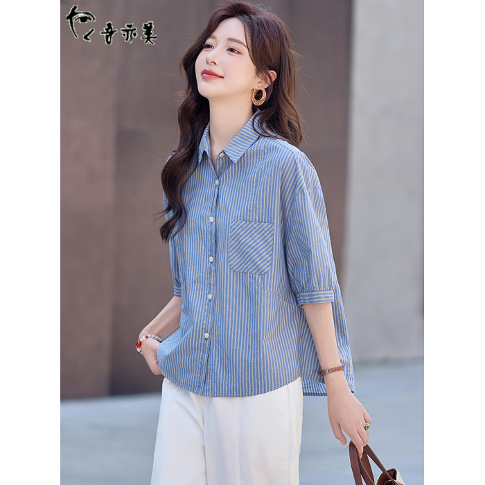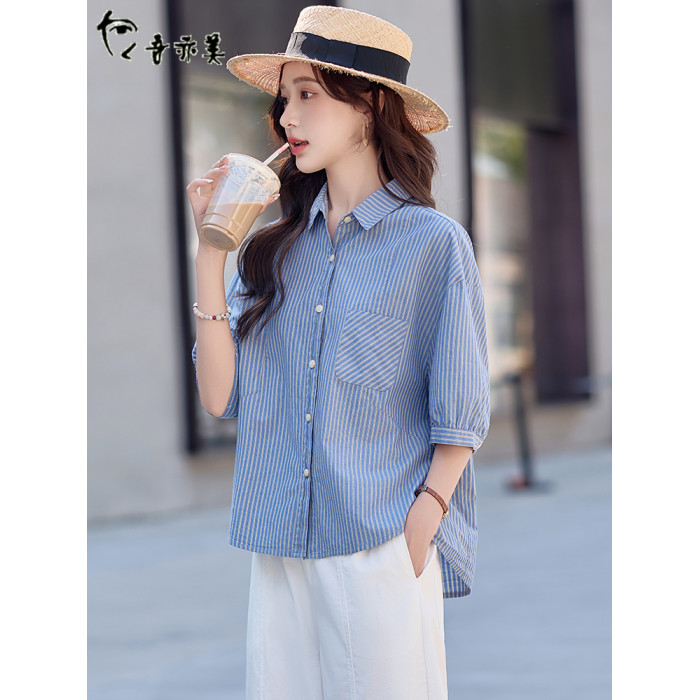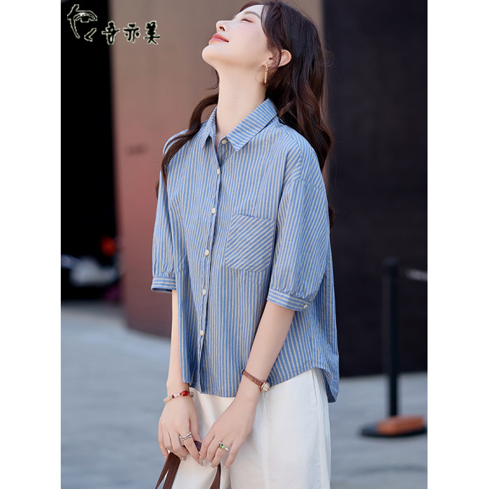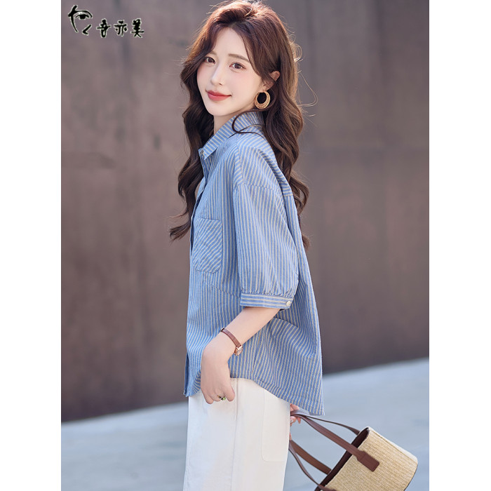 藍色條紋短袖襯衫女士夏季薄款休閒襯衣2025新款韓版落肩漂亮上衣