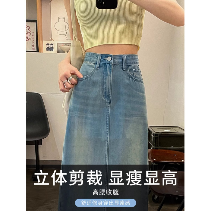 天絲牛仔半身裙女夏季薄款2025年a字開叉高腰復古中長款包臀裙子