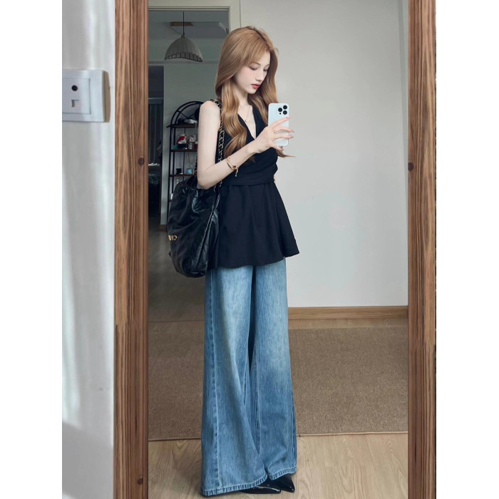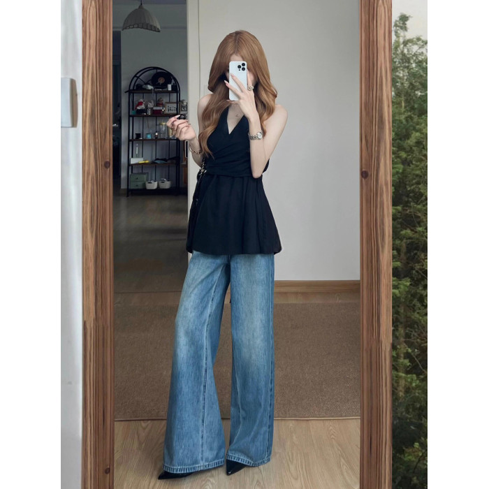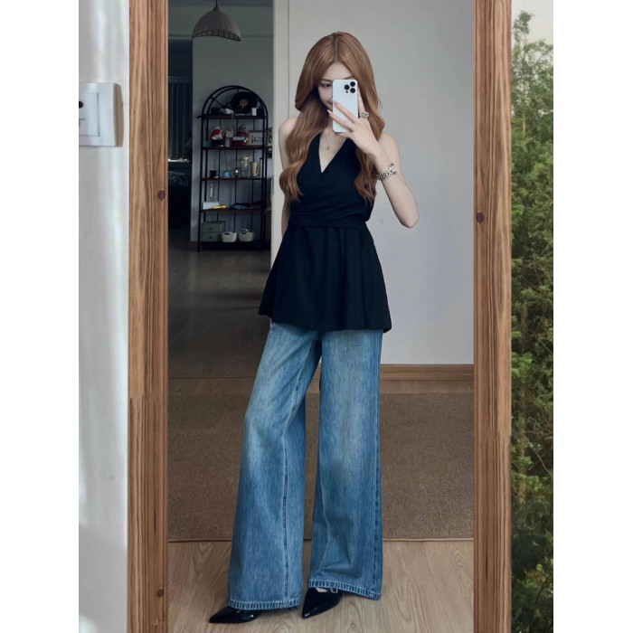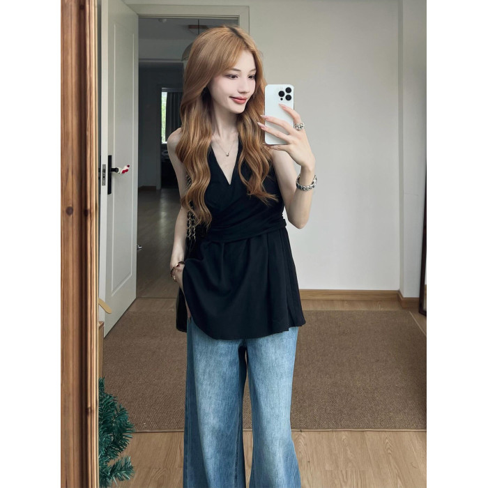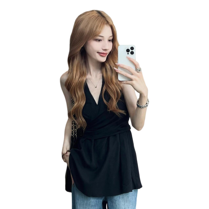 2025新款黑色法式v領掛脖無袖襯衫女夏季辣妹背心外穿設計感上衣