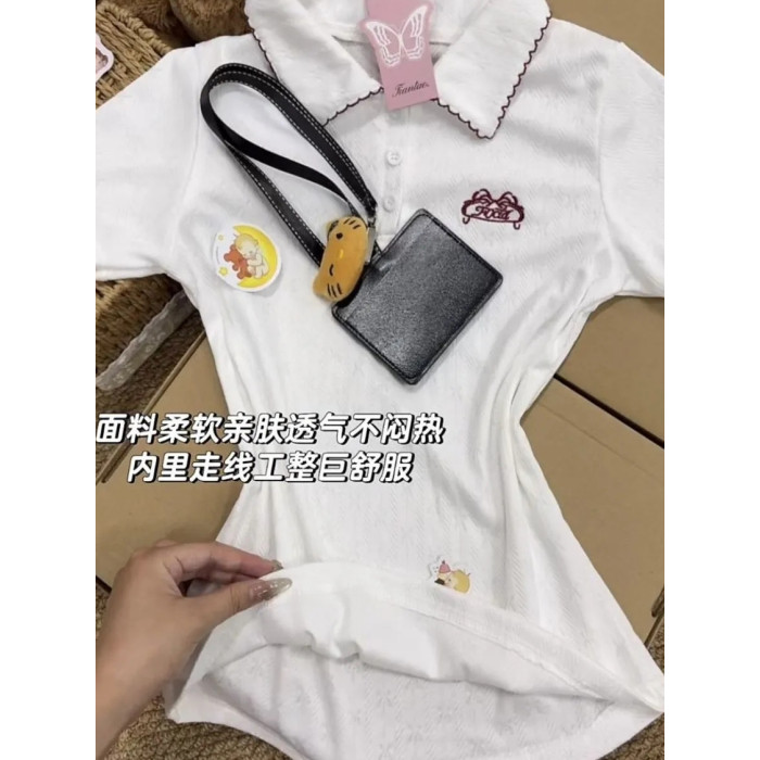 學院風辣妹修身顯瘦polo領短袖女新款蝴蝶結波點百褶短裙套裝