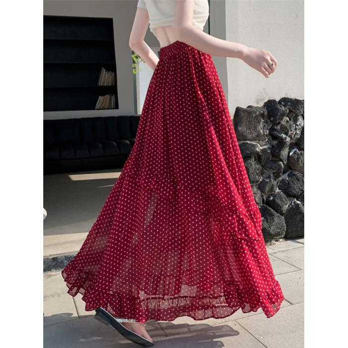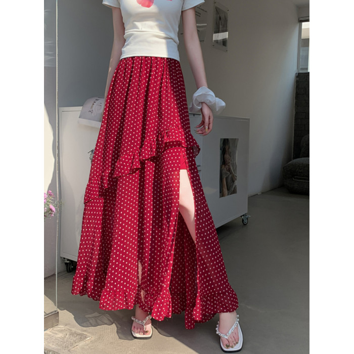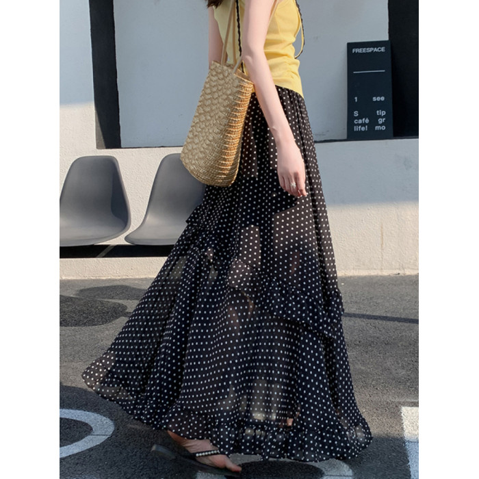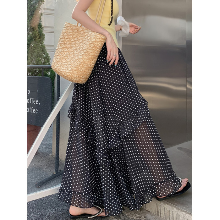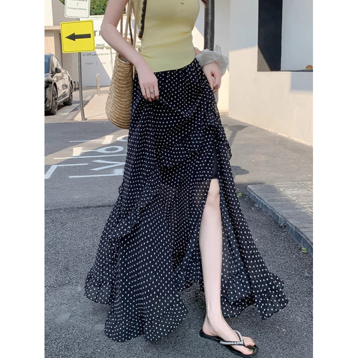 不規則波點半身裙女夏季2025新款開叉蛋糕裙夏日絕美薄款雪紡長裙