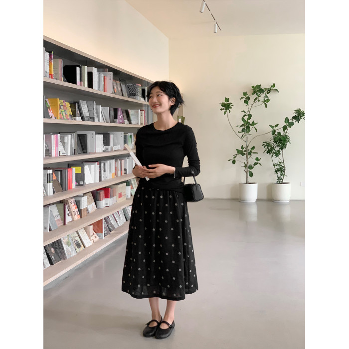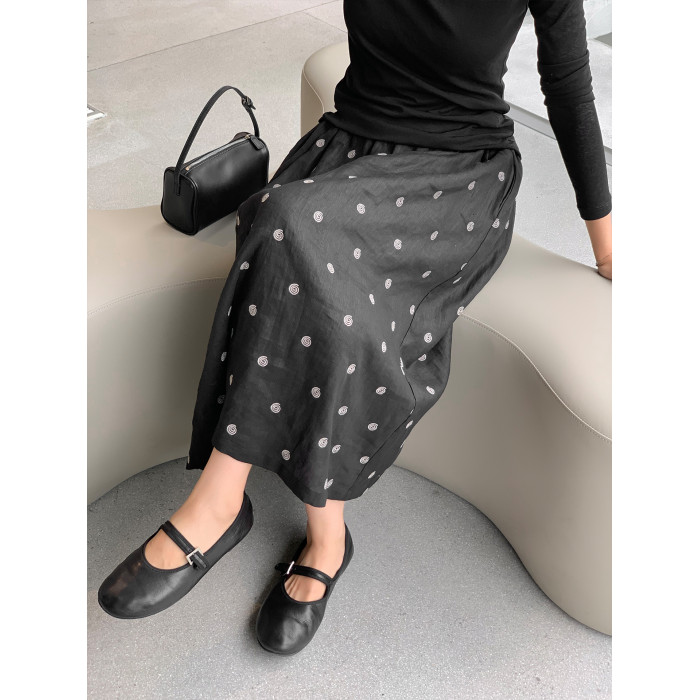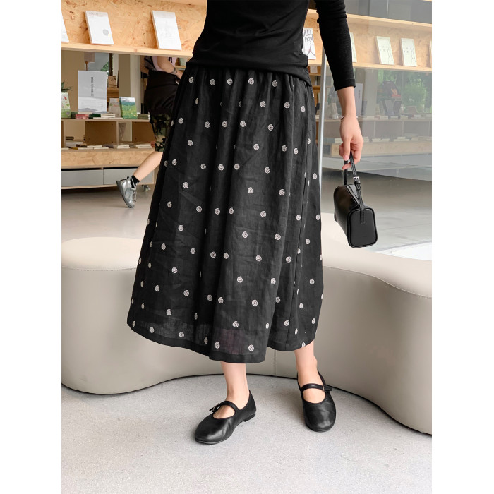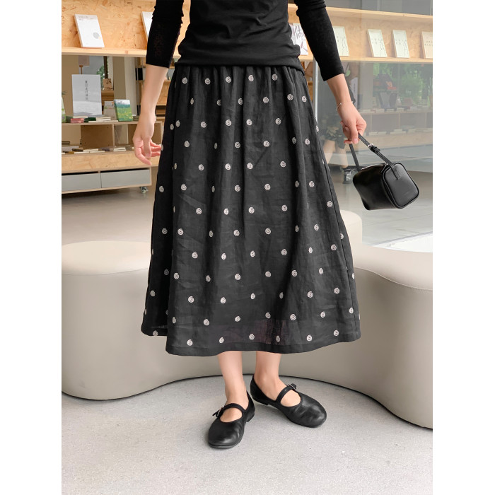周小雅法式復古波點刺綉松緊腰2025年夏季新款亞麻A字裙半身裙女