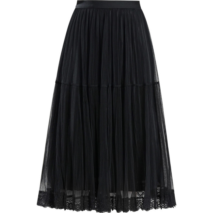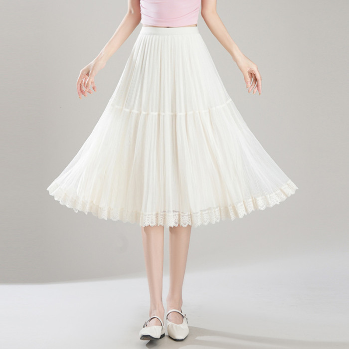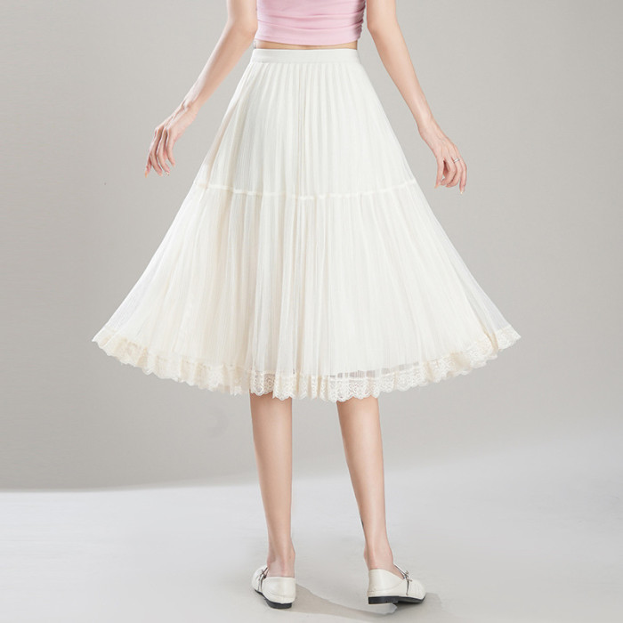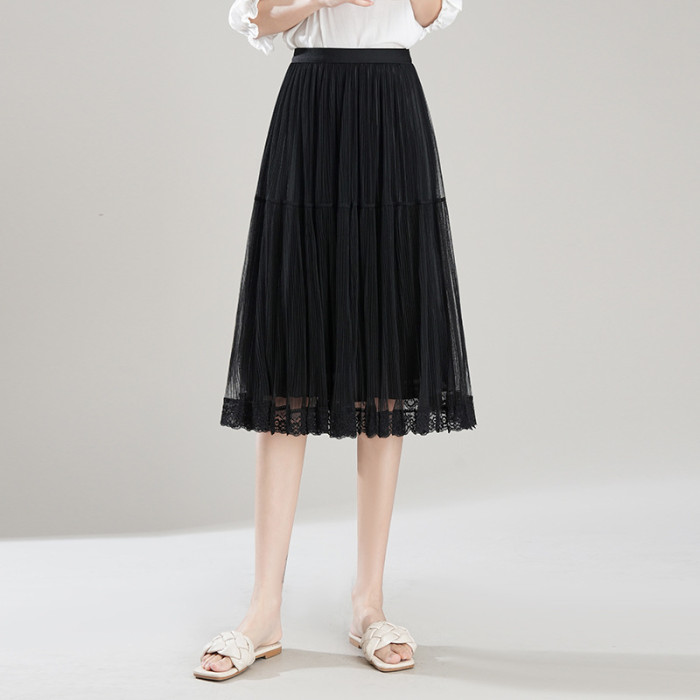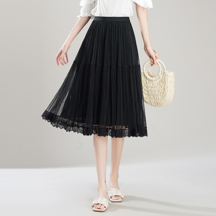 高級感網紗拼接蕾絲半身裙女夏季新款韓版A字中裙氣質松緊百褶裙
