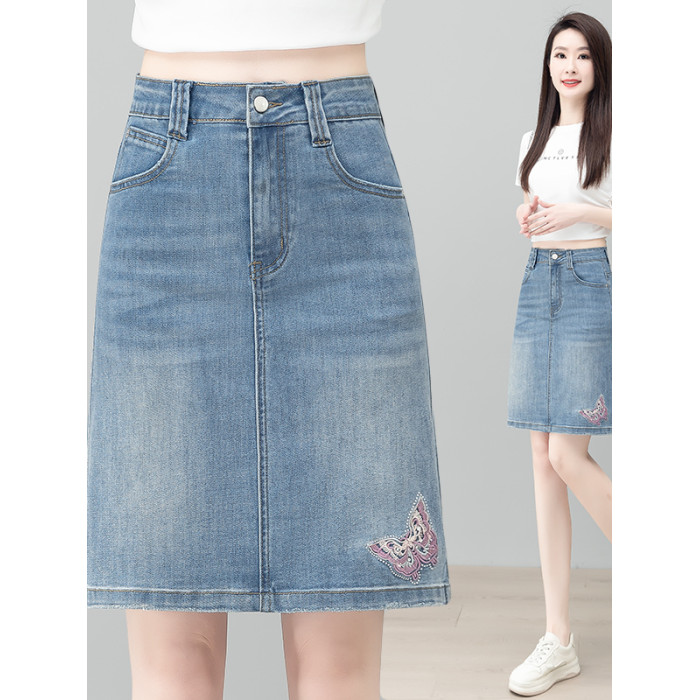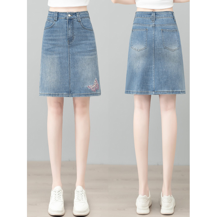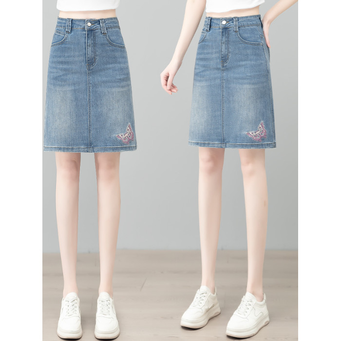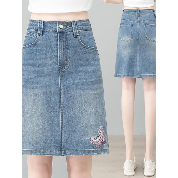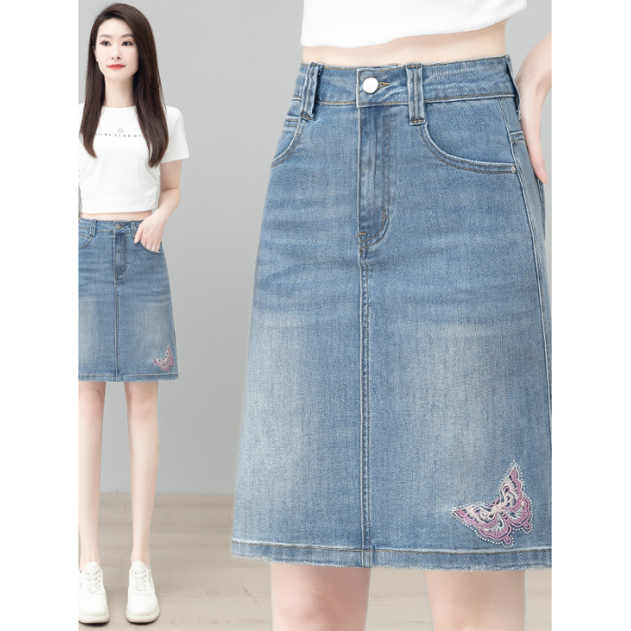 隅見丨蝴蝶刺綉牛仔半身裙女夏季薄款復古高腰顯瘦彈力A字包臀裙