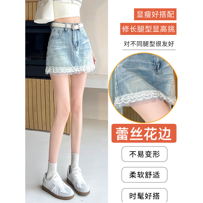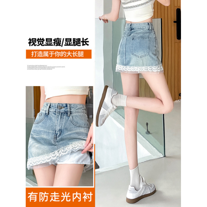 妍度蕾絲拼接牛仔半身短裙女夏季薄高腰a字寬松遮腿型辣妹穿搭包