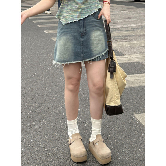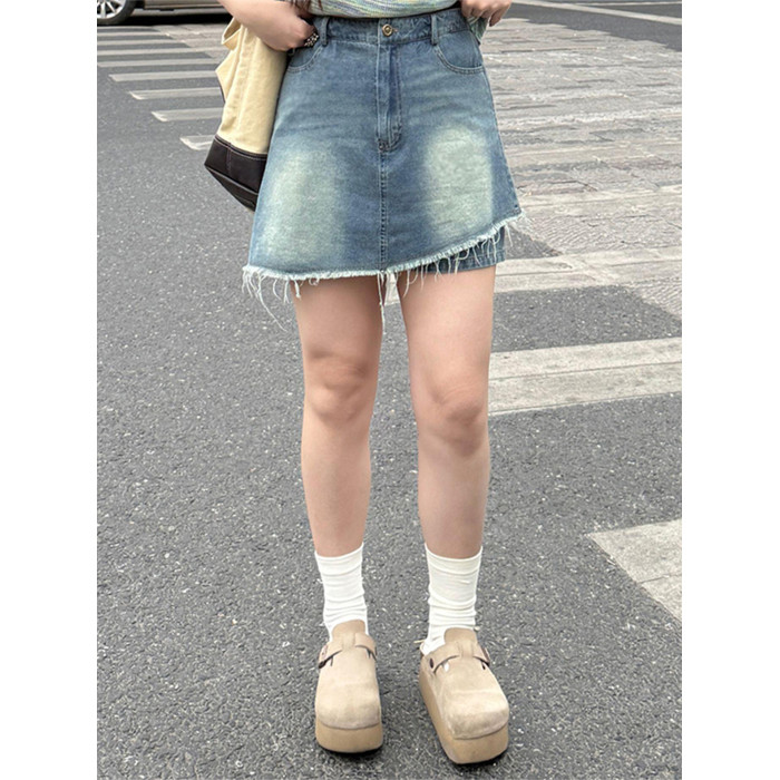 300斤特大碼復古高腰a字牛仔裙褲女胖mm新款毛邊小衆設計感短裙子