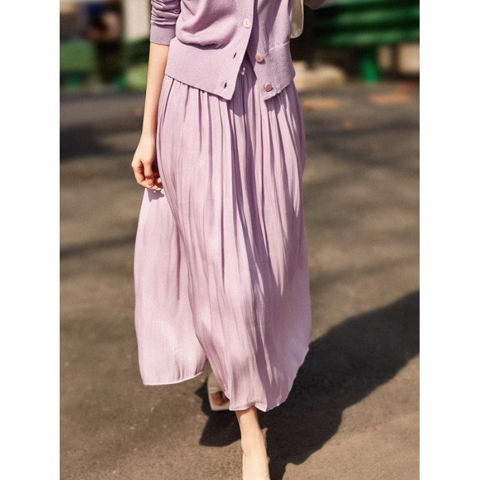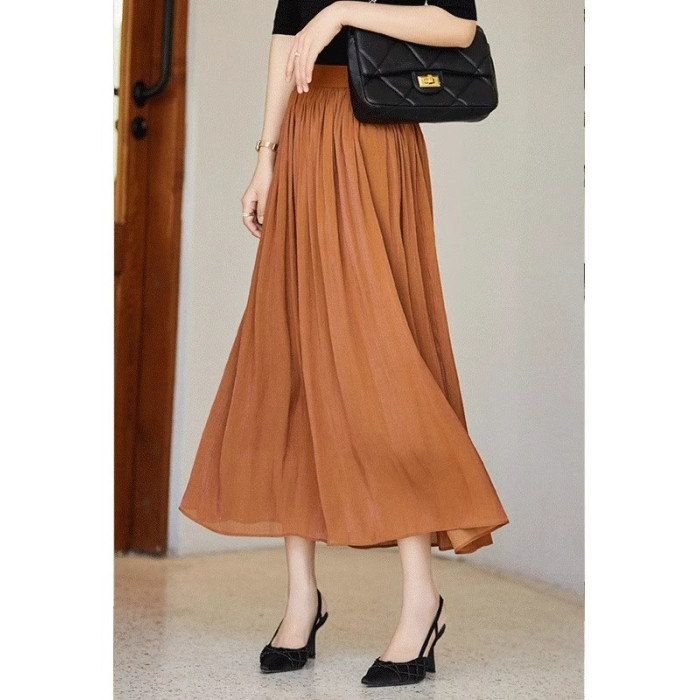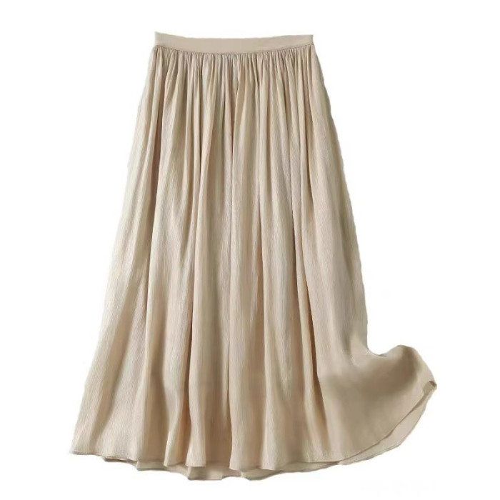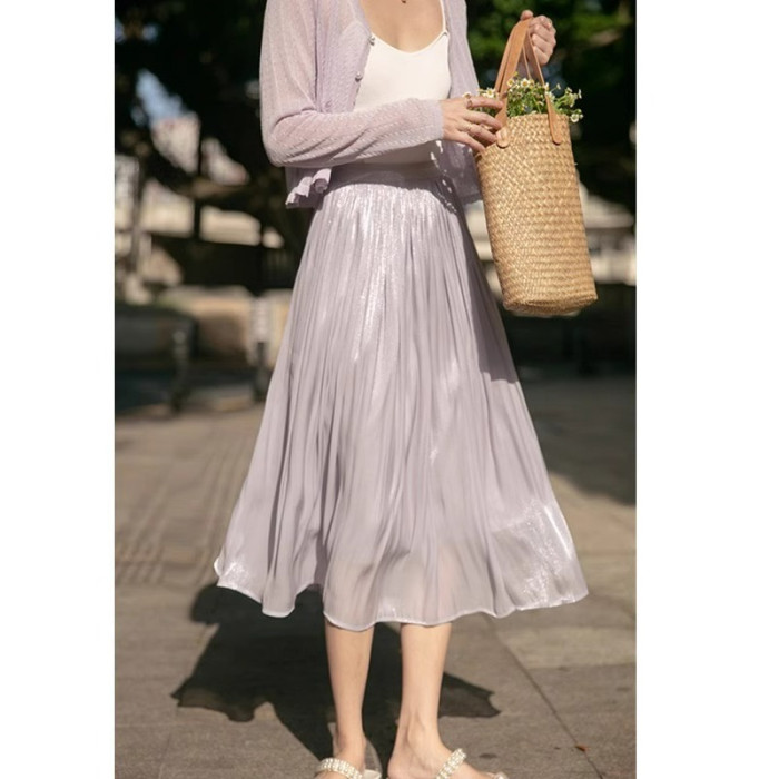 夏季法式牛奶珠光半身裙女小個子A字真絲繖裙高腰薄針織顯瘦長裙