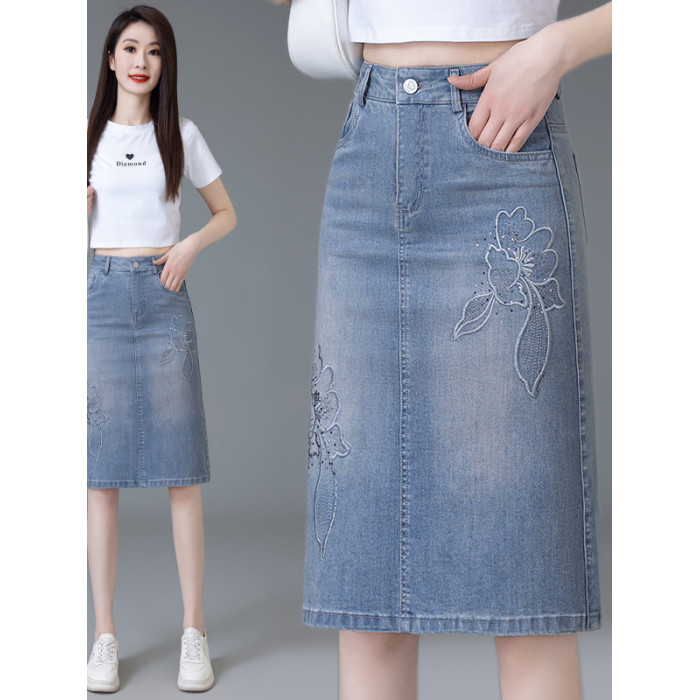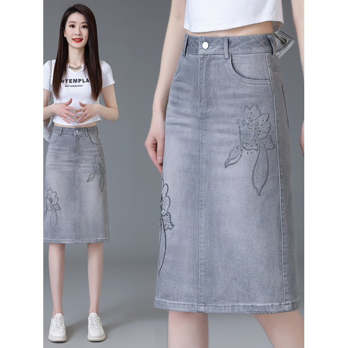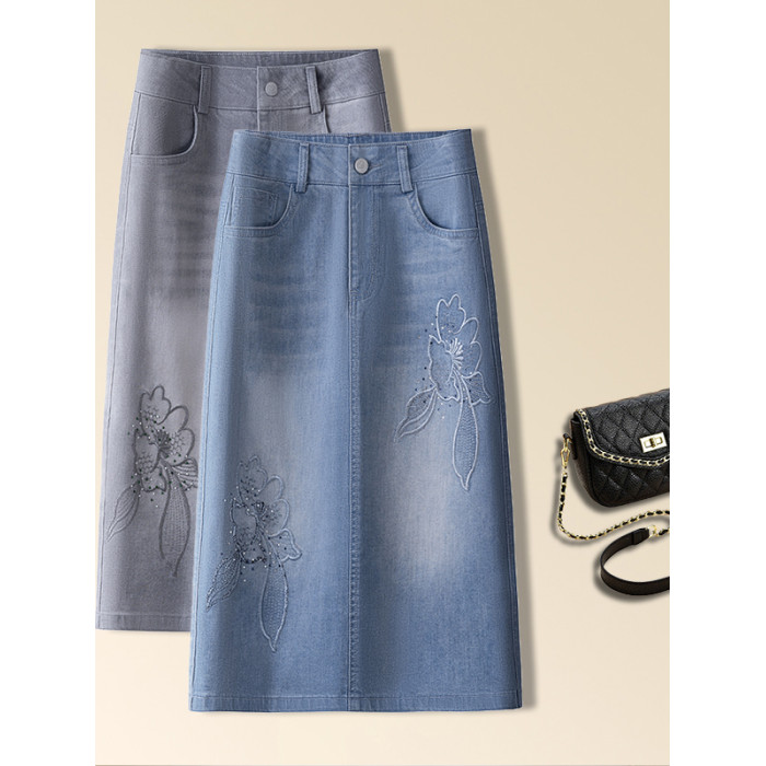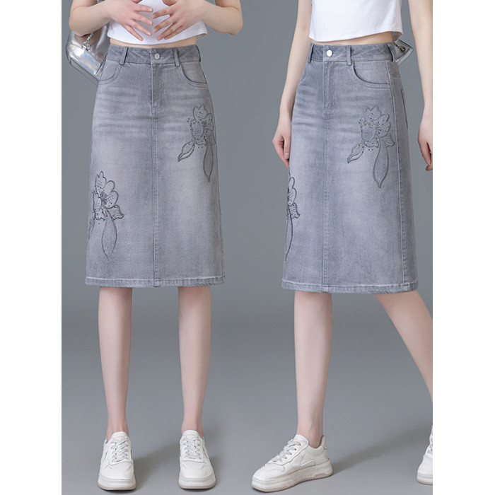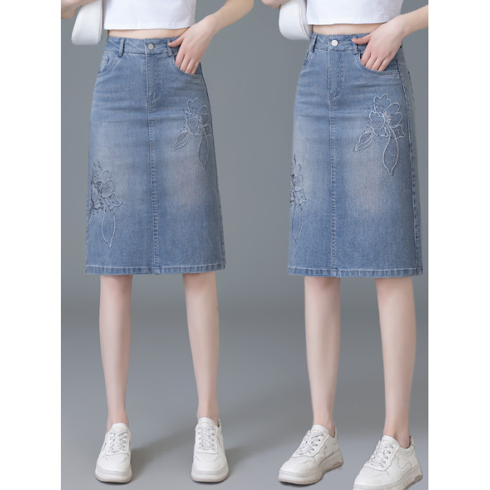 隅見丨刺綉花牛仔半身裙女夏季2025新款高腰顯瘦中長款一步包臀裙