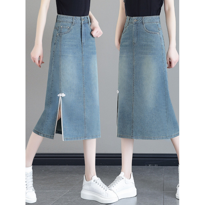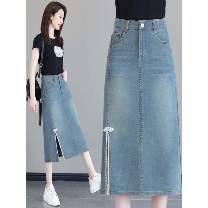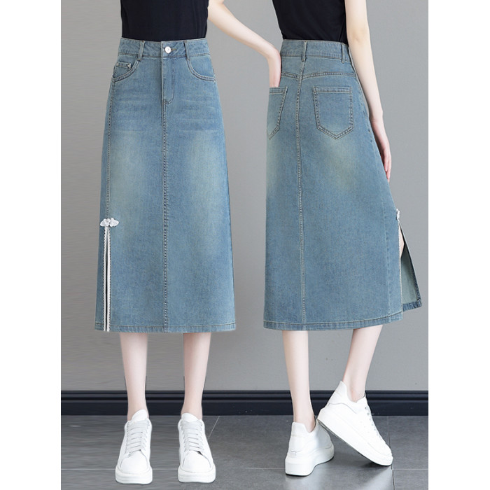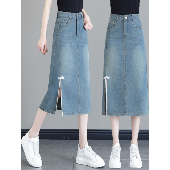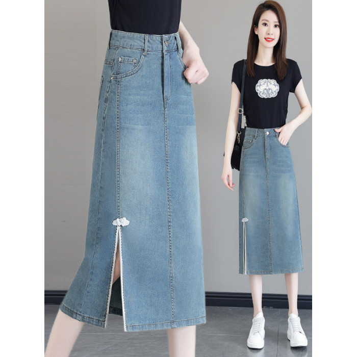 隅見丨國風開叉牛仔半身裙女夏2025新款高腰中長款a字一步包臀裙