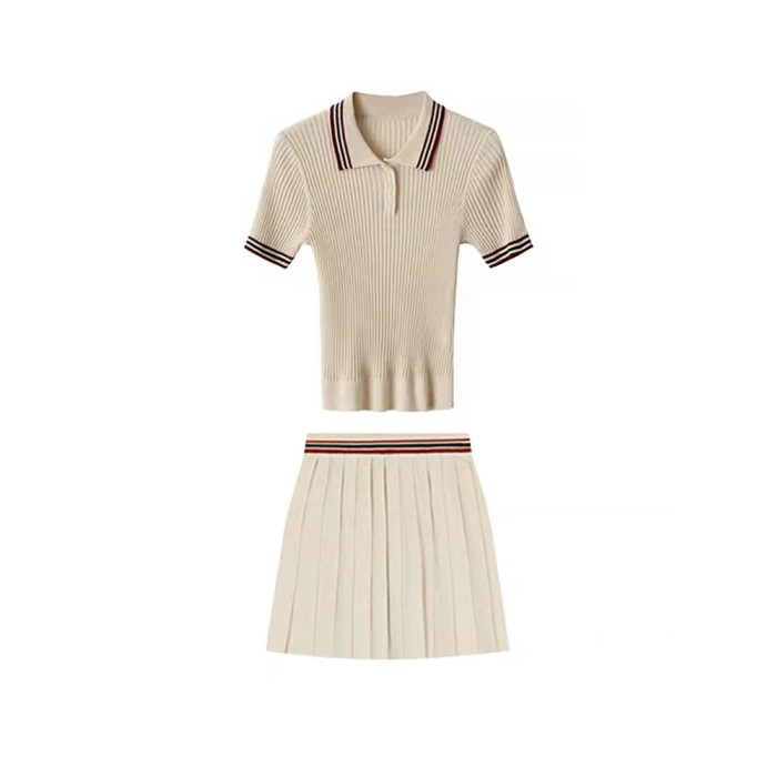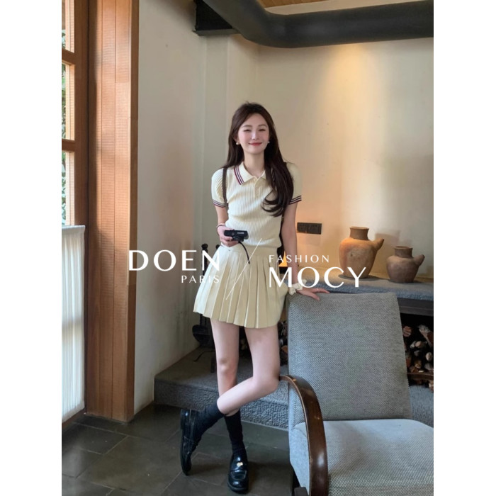 DOEN MOCY千金學院風套裝miu系polo領針織衫短袖上衣百褶半身短裙