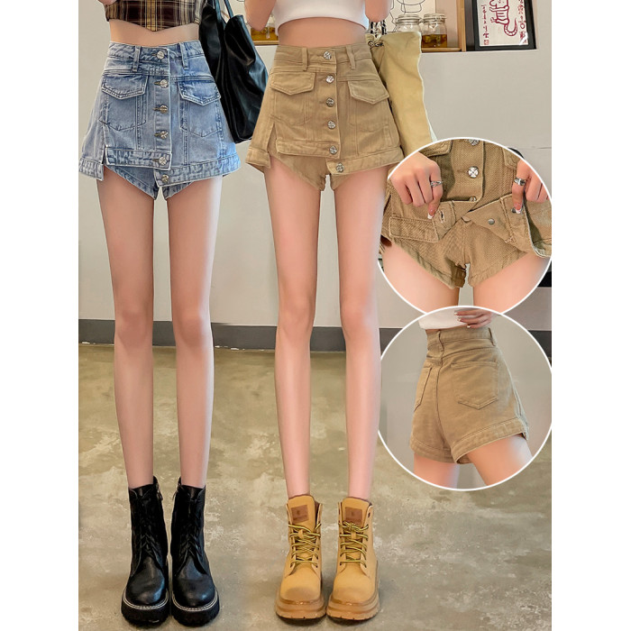 妍度夏季牛仔短裙女高腰裙褲辣妹工裝防走光卡其棕色褲裙短褲子