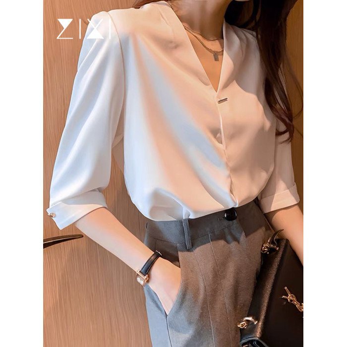 白色雪紡襯衫氣質通勤職業裝女夏季上衣OL正裝v領半袖短袖白襯衣