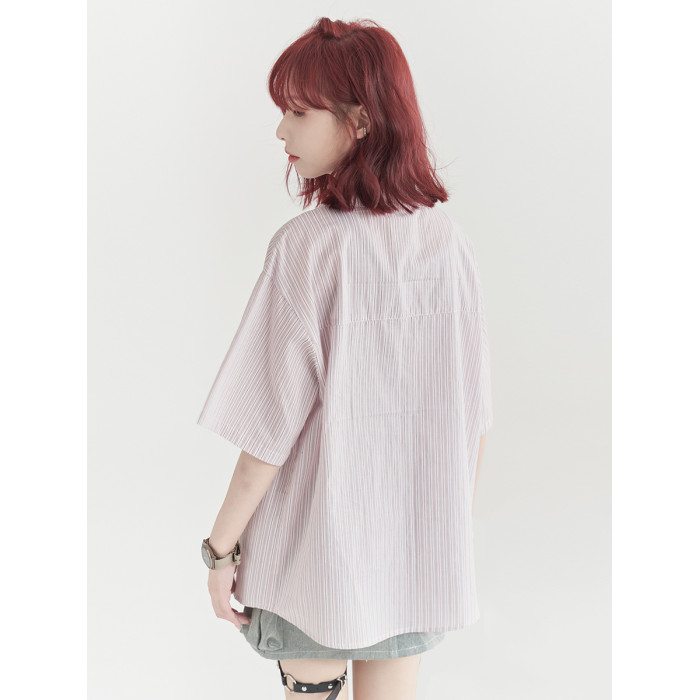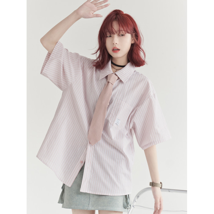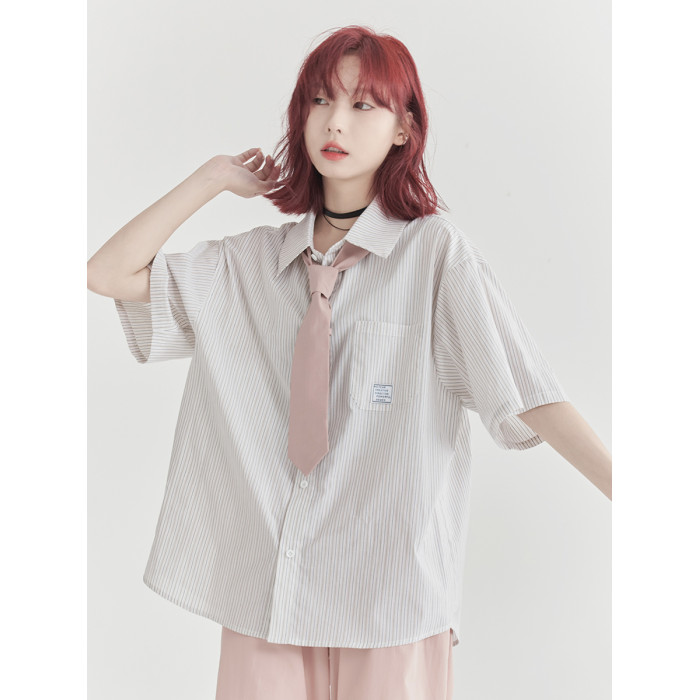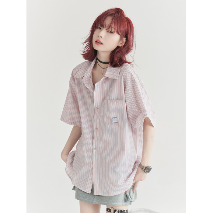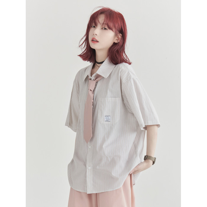 萬有引力博物館 復古細條紋短袖襯衫女夏季2025新款襯衣寬松上衣