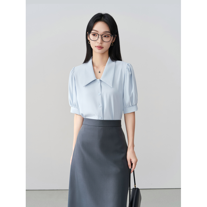 伯德小姐藍色短袖雪紡襯衫職業面試穿搭女士職場通勤上衣正裝襯衣