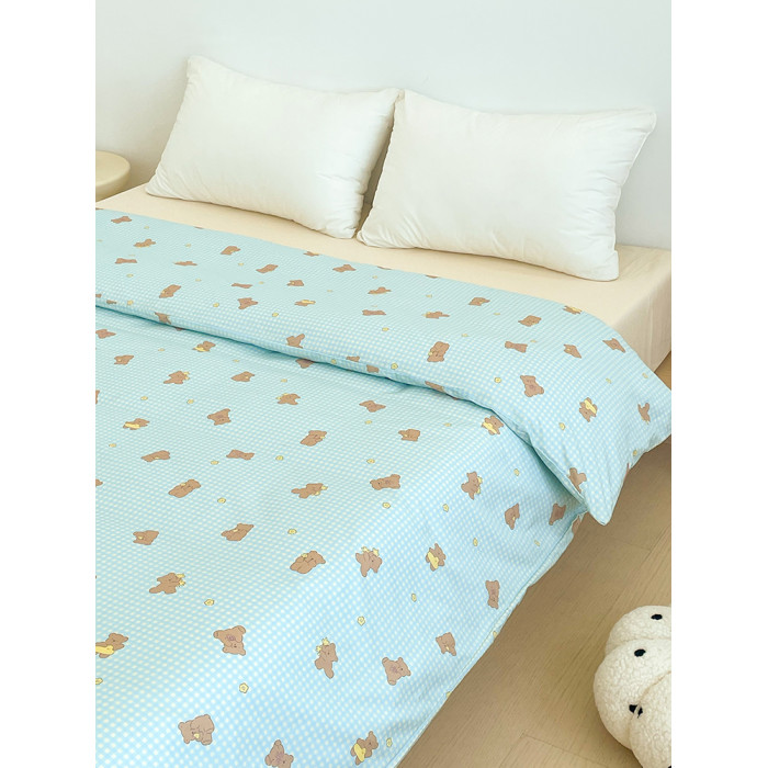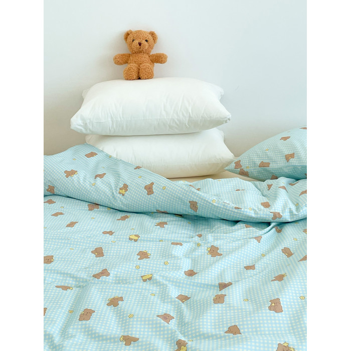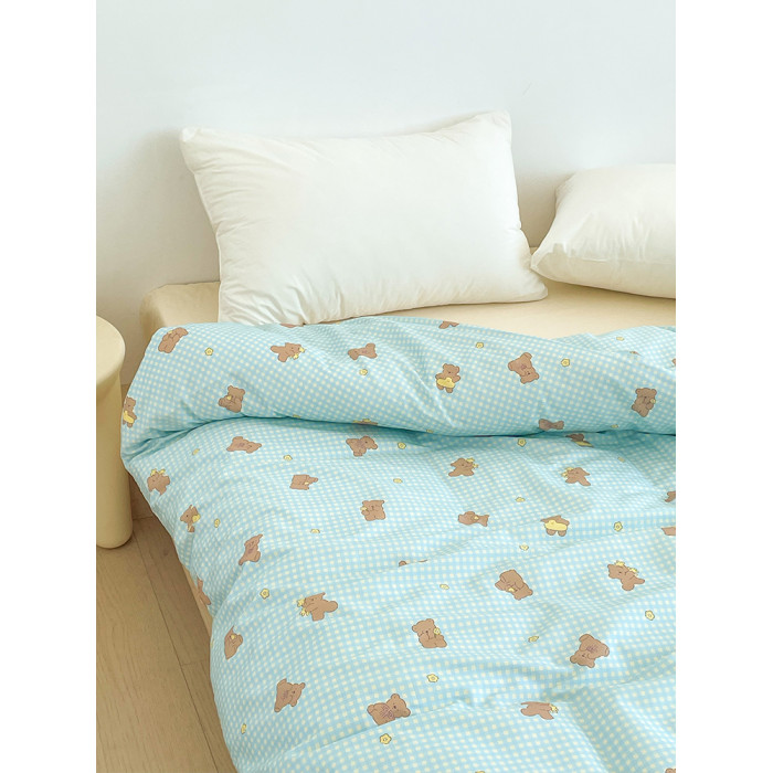 啵啵小熊 奶油系格子小熊全棉卡通被套被芯罩學生床單件ins可愛藍