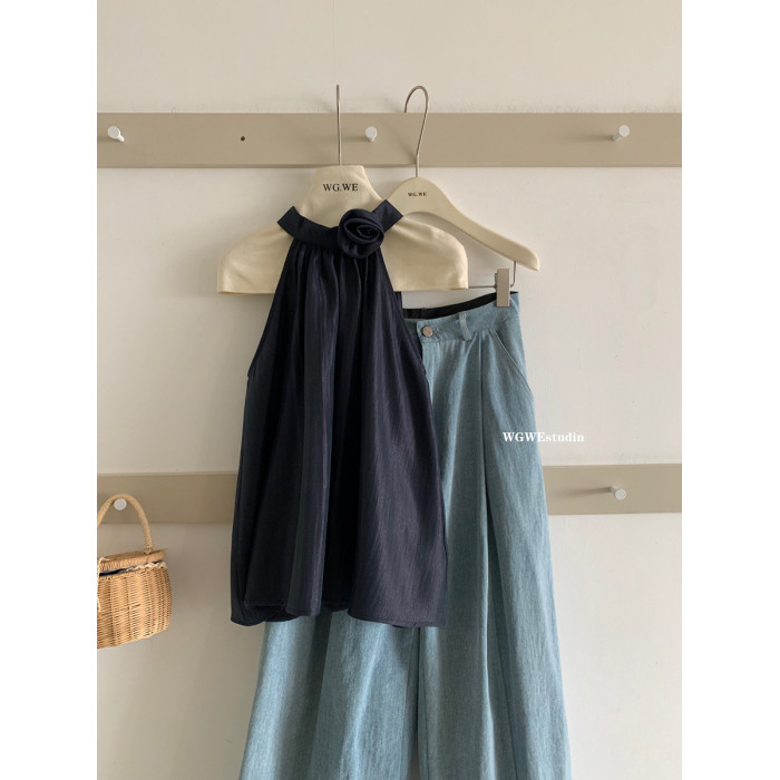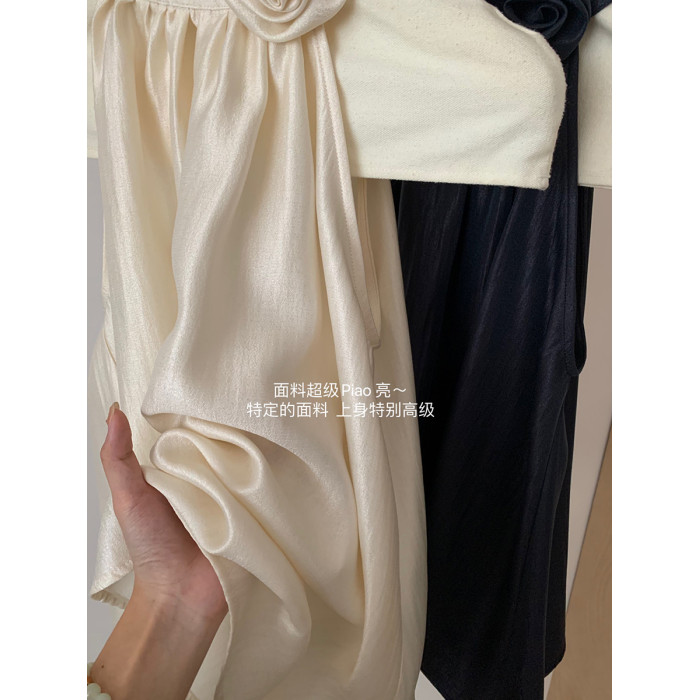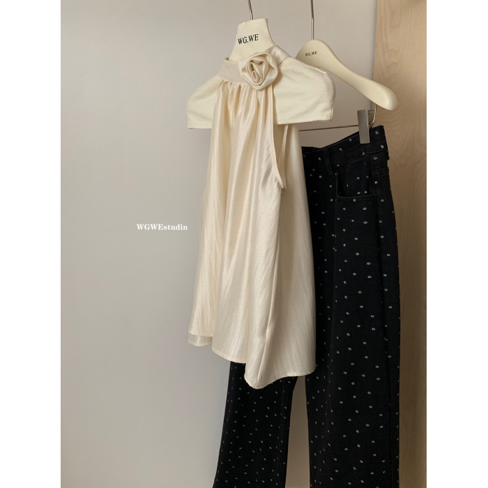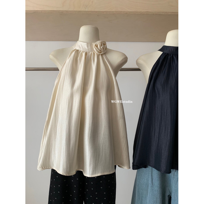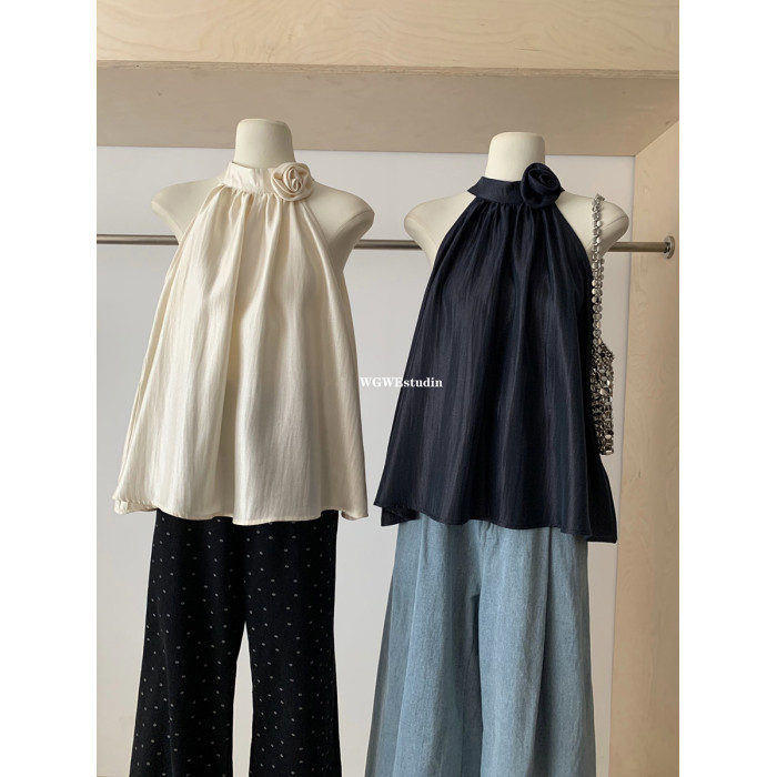 高級感光澤掛脖玫瑰花背心襯衫女無袖寬松顯瘦法式氣質緞面上衣