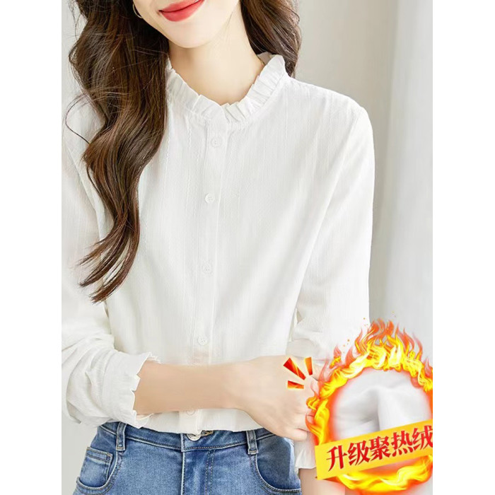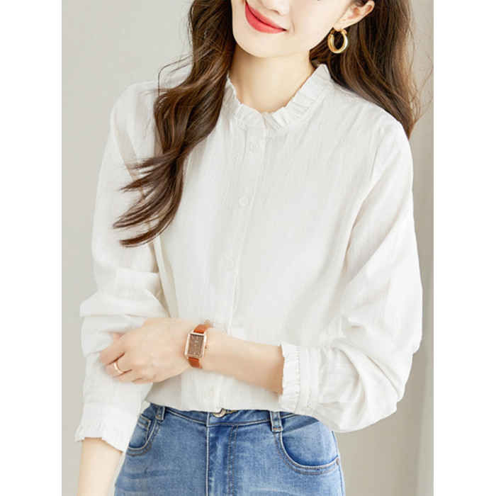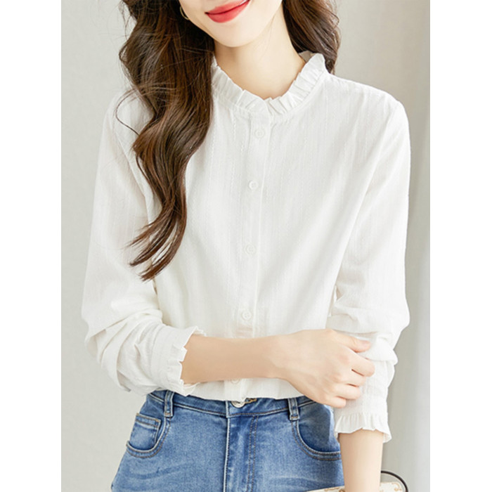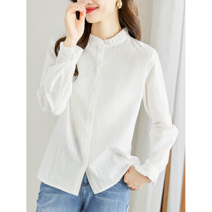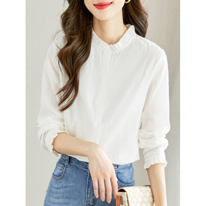 2025春夏新款純棉白色襯衫女花邊立領通勤職業洋氣白色棉襯衣女