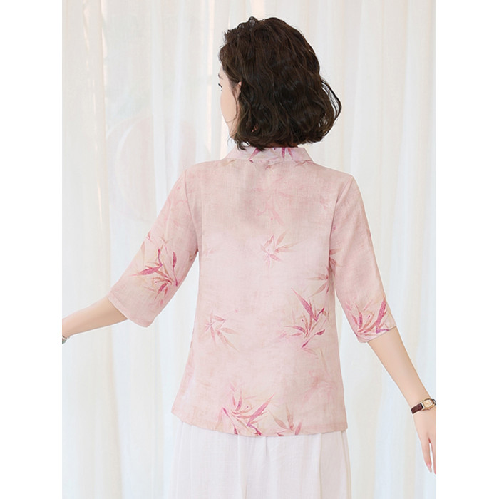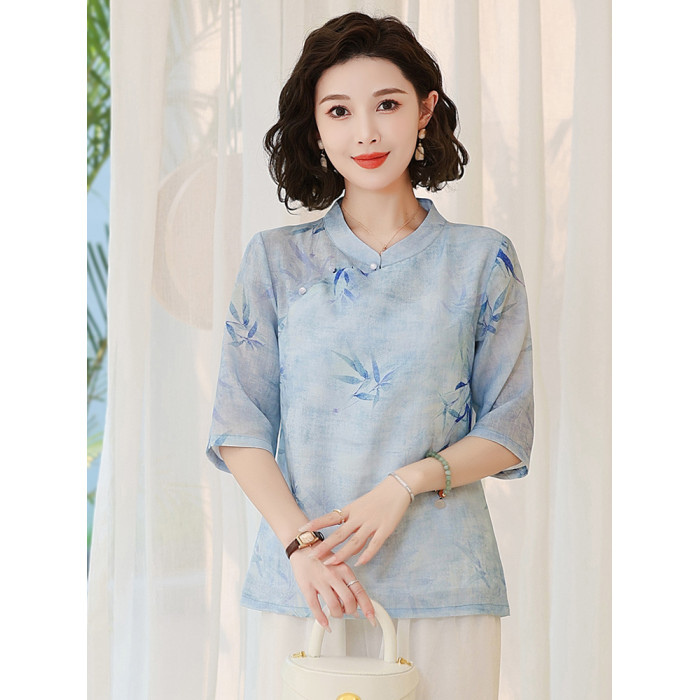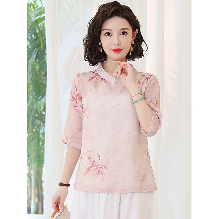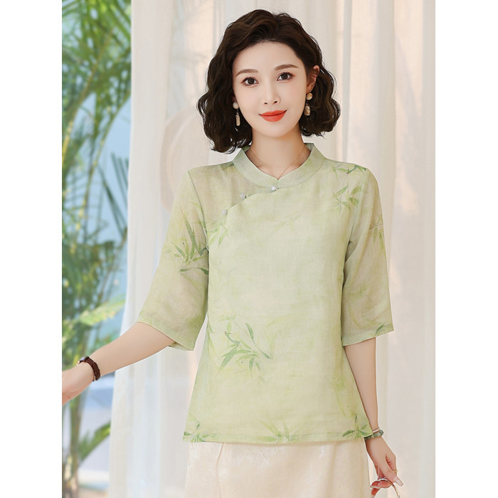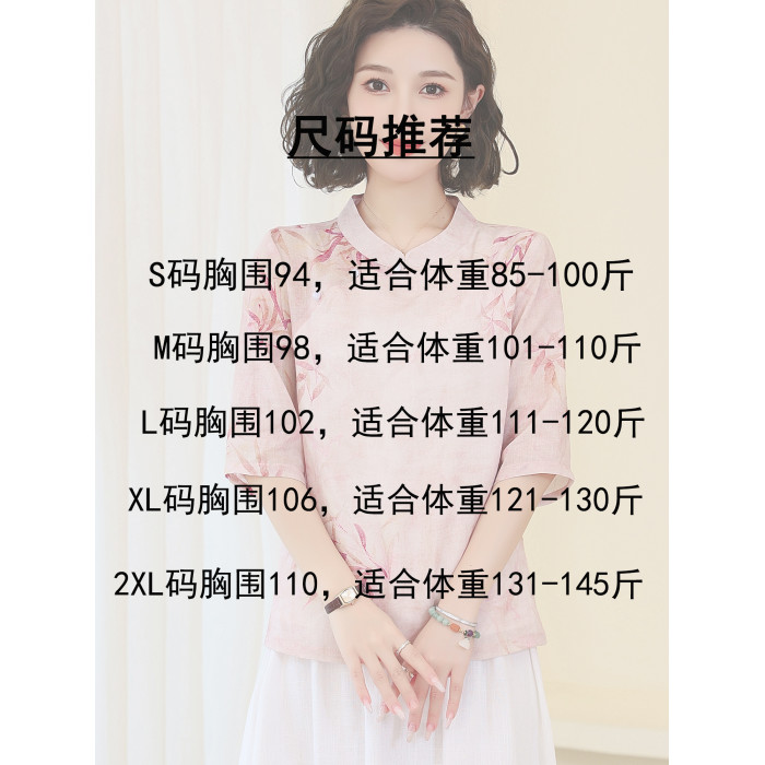 新中式2025夏新款復古民族國風女裝襯衫斜襟苧麻印花短袖T恤上衣