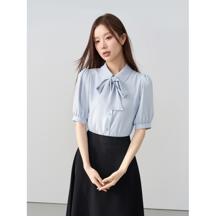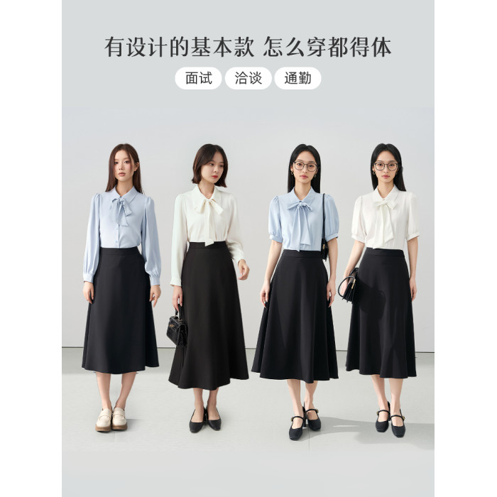 伯德小姐藍色高級感短袖襯衫女教師穿搭雪紡上衣面試正裝職業襯衣