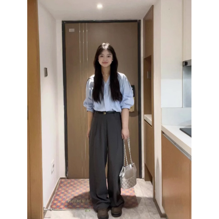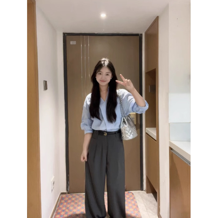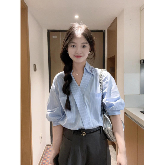 法式藍條紋短袖襯衫女夏季高級感設計感小衆寬松襯衣通勤職場上衣