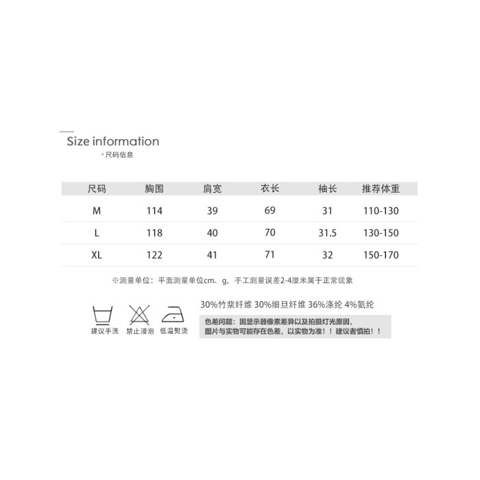 材質成分 聚對苯二甲酸乙二酯(滌綸)36% 竹原纖維(竹纖維)30% 其他材質30% 聚氨酯彈性纖維(氨綸)4%