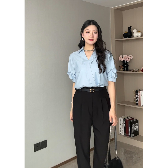 正肩短袖襯衫女大碼V領法式氣質寬松顯瘦設計感面試通勤中袖襯衣