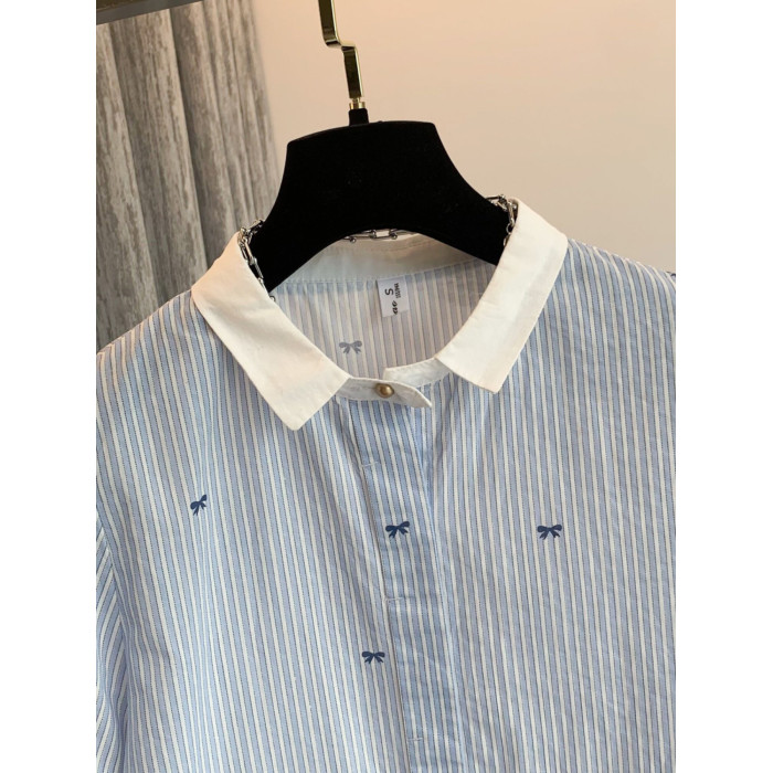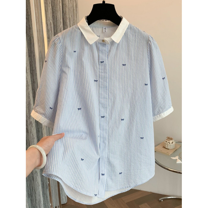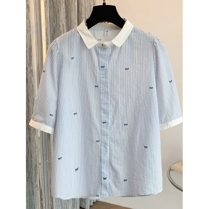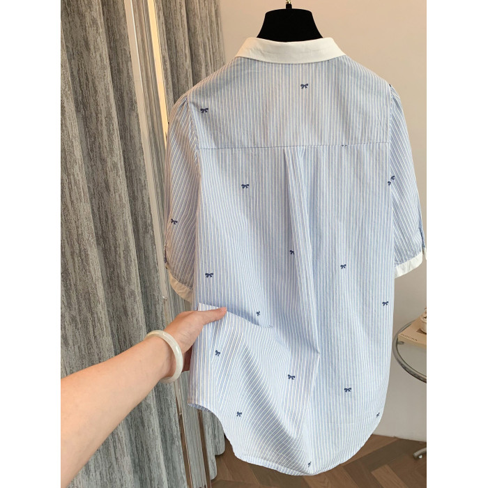 藍色條紋襯衫短袖文藝小清新蝴蝶結印花時尚拼接純棉夏季女裝襯衣