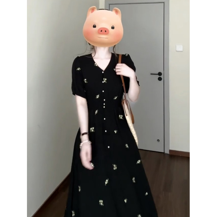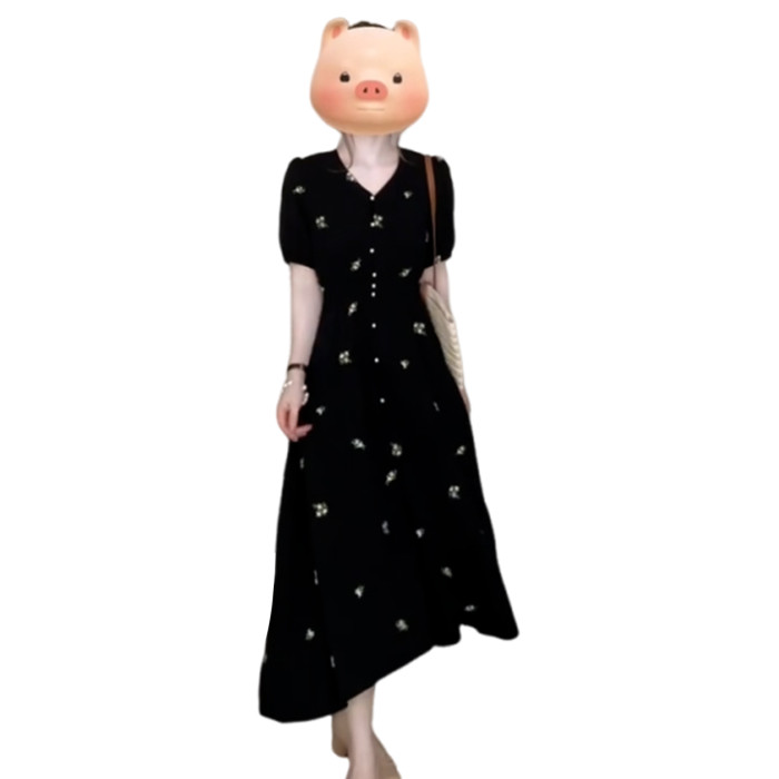 法式v領黑色碎花襯衫連衣裙子女夏季2025新款夏日巨好看短袖長裙
