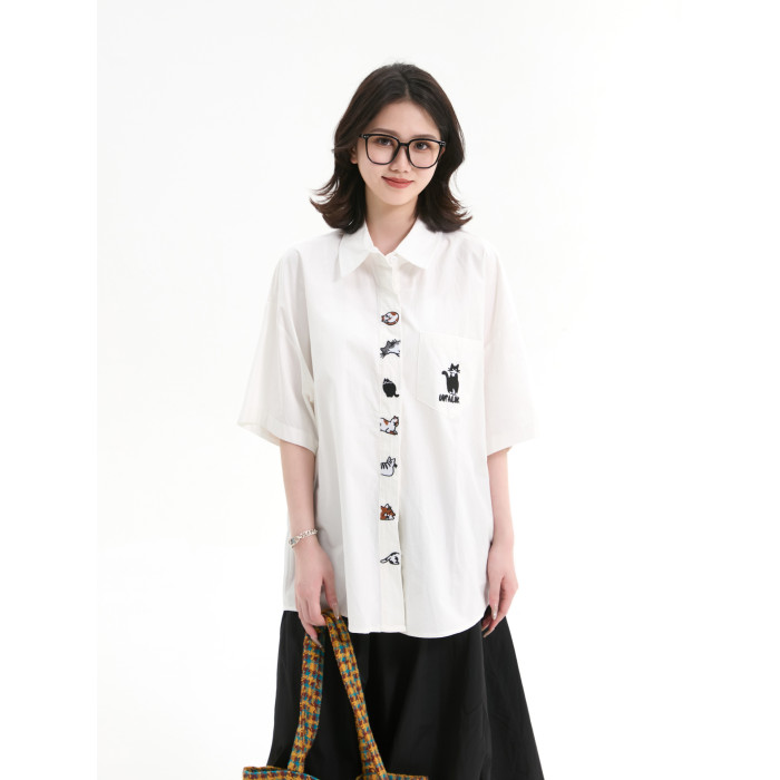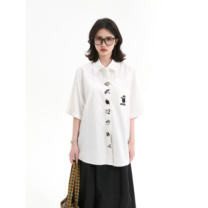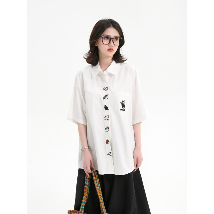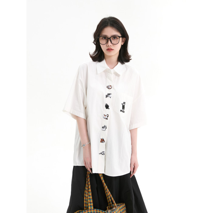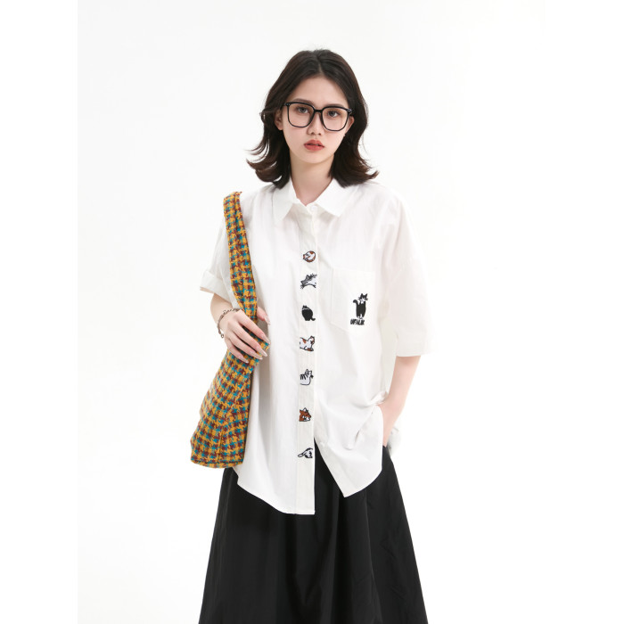 7KEEWEN日系復古寬松潮牌學院風可愛貓咪刺綉白色短袖襯衫上衣女